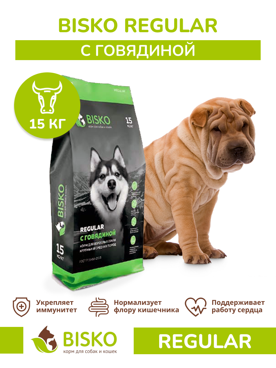Сухой полнорационный корм Биско Регуляр для взрослых собак со средним уровнем активности, 15 кг: сравнение цен, характеристики, фото, актуальное наличие и цены.