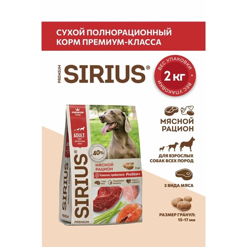 Сухой полнорационный корм для взрослых собак Мясной рацион содержит 3 вида мяса (курица, говядина и рыба). Разнообразие ингредиентов животного происхождения содержит в себе весь спектр незаменимых аминокислот, витаминов и минералов, необходимых питомцу