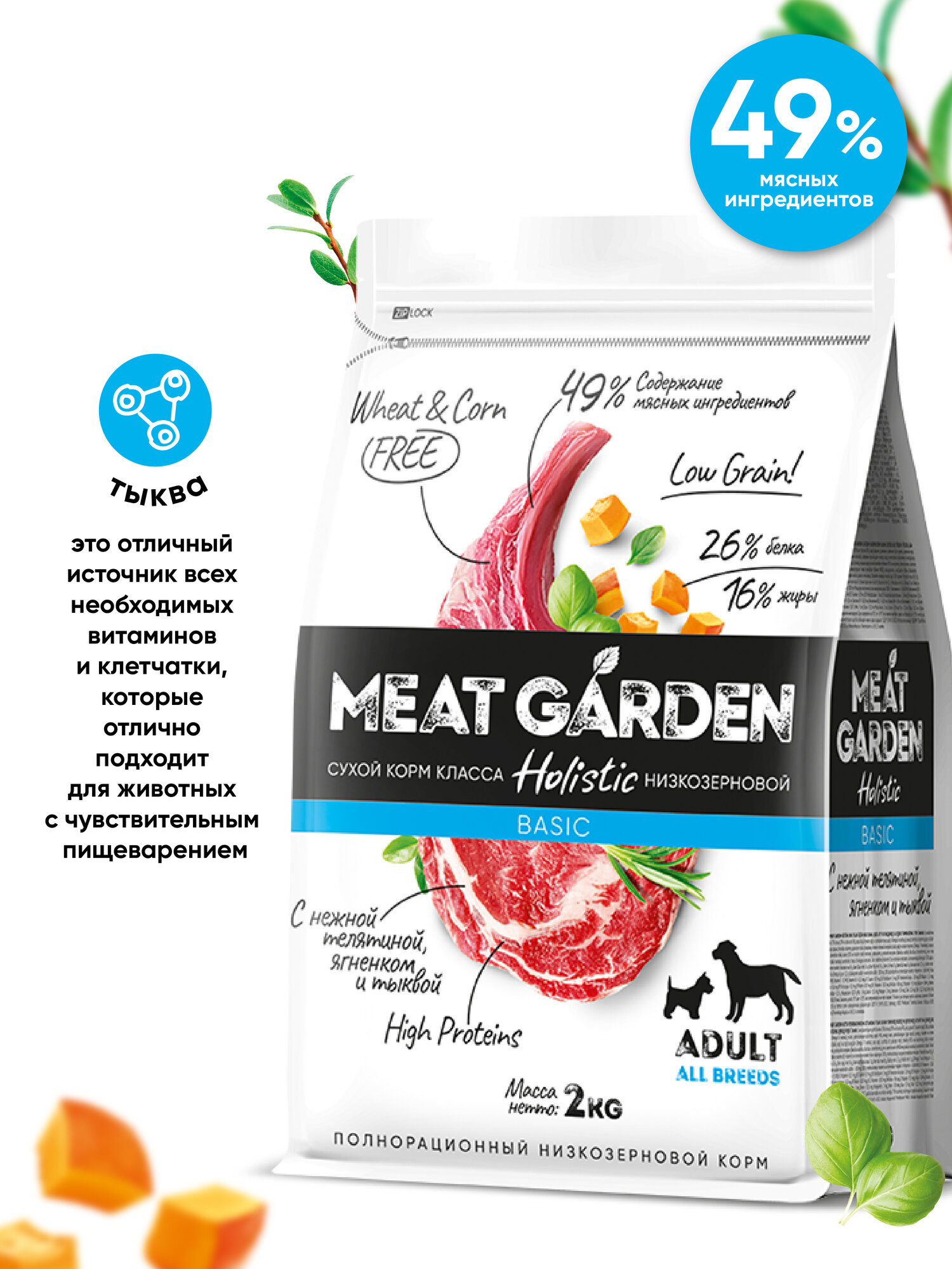Meat Garden Basic – это сухой полнорационный корм для взрослых собак всех пород с нежной телятиной, ягненком и тыквой. Он придется по вкусу даже самым привередливым питомцам, благодаря изысканному сочетанию вкусов мяса ягненка, телятины и тыквы.