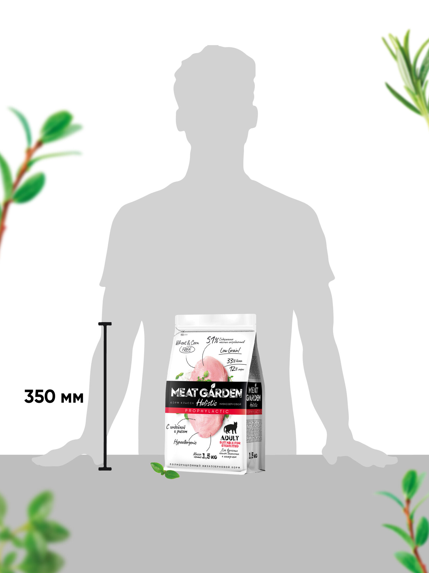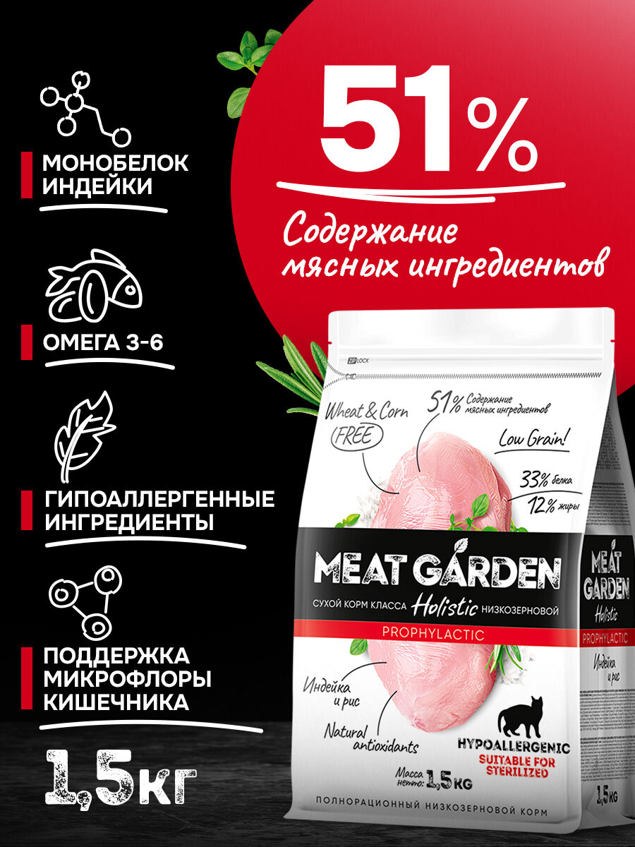 Сухой корм Meat Garden - для стерилизованных кошек, склонных к аллергии, Индейка с Рисом, 1.5кг, 1шт Вес: 1,5 кг.