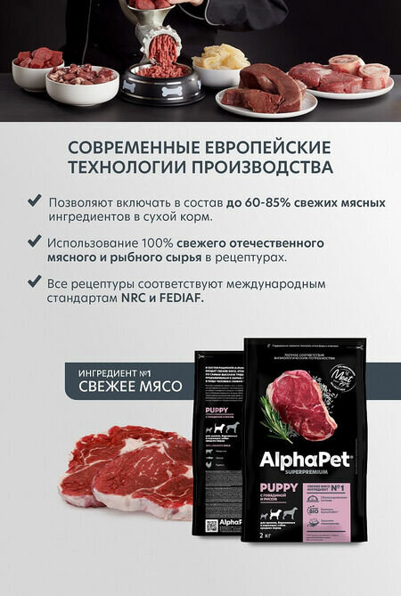 AlphaРet Superpremium — выбор владельцев, которые хотят быть уверены в том, что дают своему питомцу лучшее из возможного: натуральные отборные ингредиенты, высокое содержание животного белка и свежее мясо в основе состава. AlphaPet Superpremium ставит точку в споре о том, чем кормить питомца.