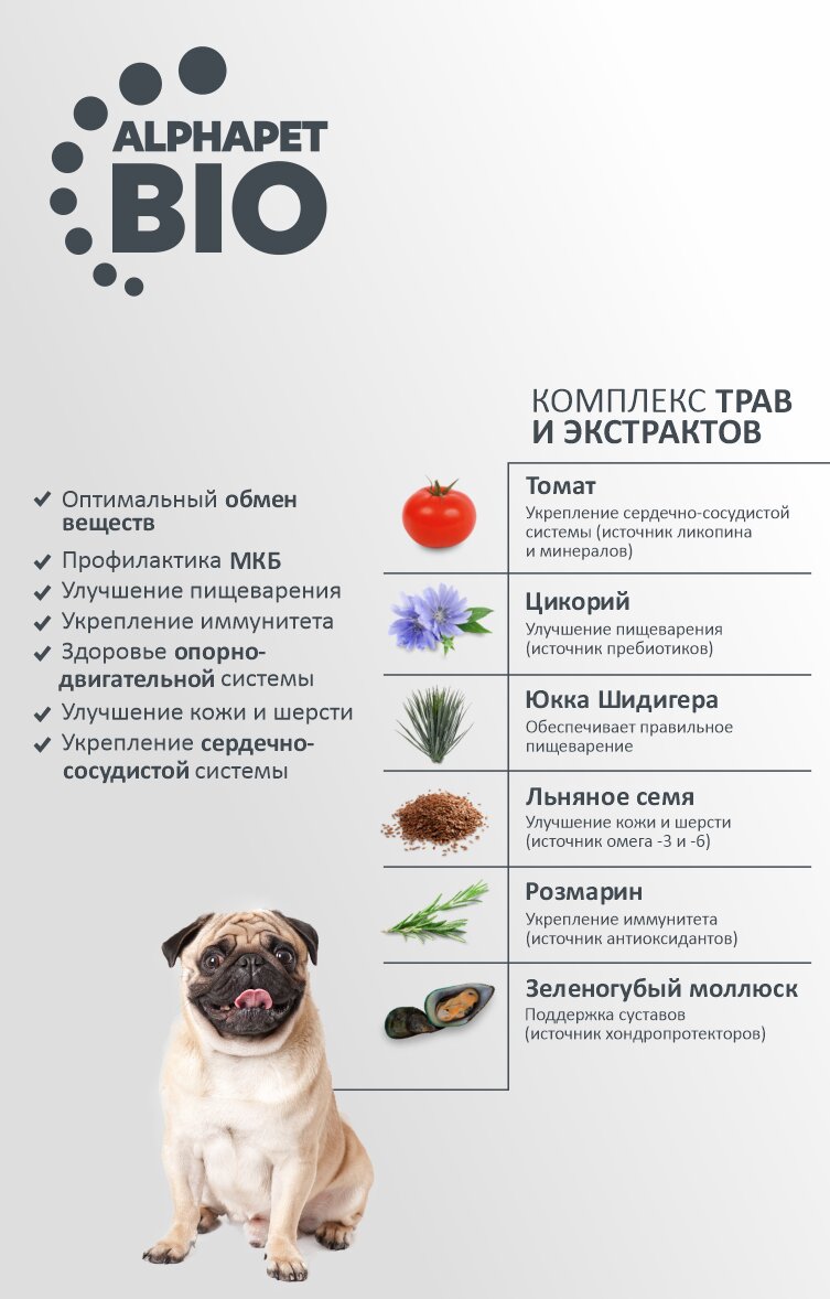Собачий корм содержит 76% качественного мясного белка. Для производства используется свежее мясо ягнёнка, курицы и свежая рыба хамса. Производитель премиум корма добавил в состав хондропротекторы для укрепления костей, суставов и связок. Зоотовары для собак снижают риск получить травму. Корма для собак средних пород AlphaPet WOW Superpremium содержат витамины, микроэлементы и минералы, а также комплекс трав и экстрактов AlphapetBIO, способствующие укреплению иммунной системы.