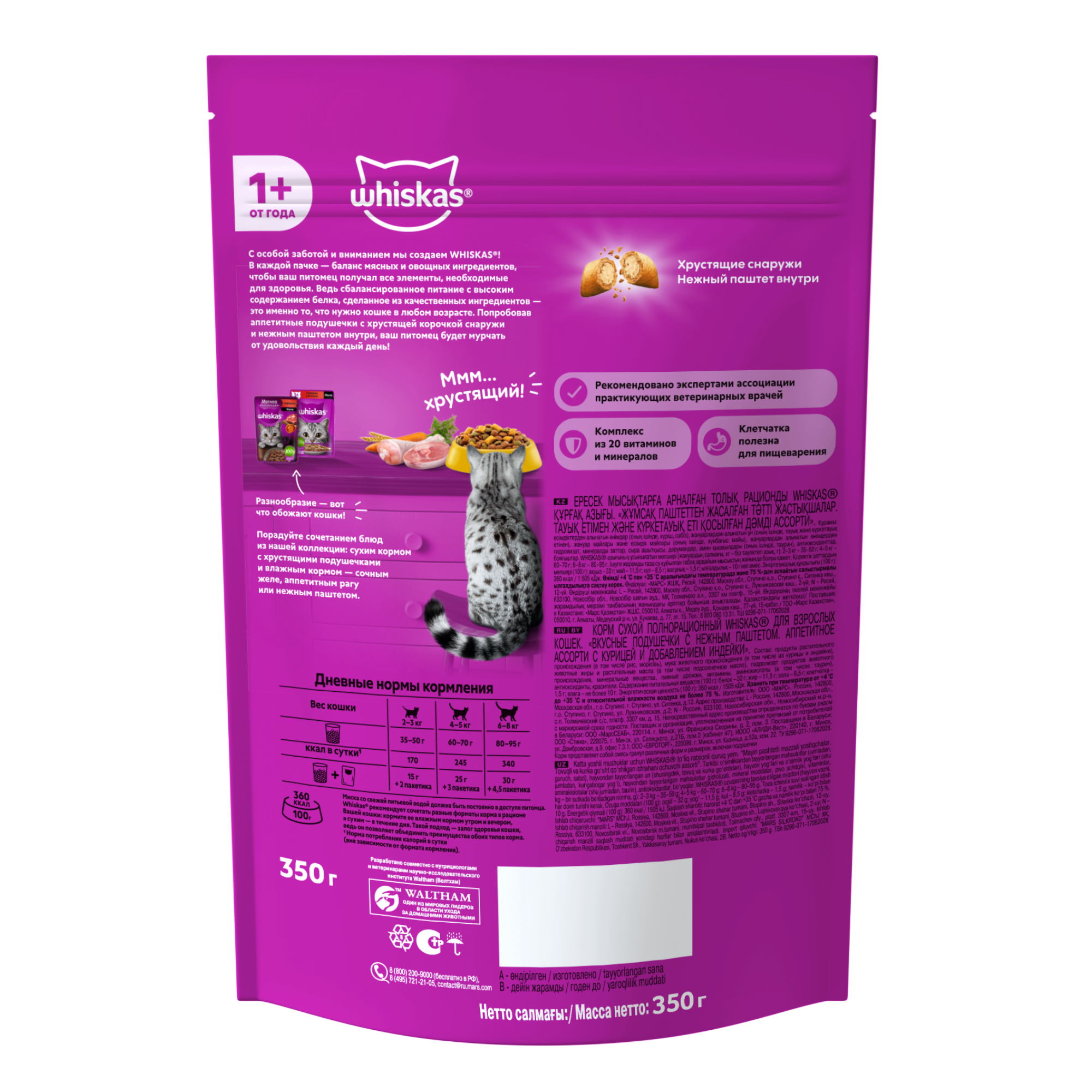Это сбалансированный рацион для здоровой и счастливой жизни Вашей кошки. Хрустящие подушечки с нежным паштетом внутри обязательно придутся по вкусу Вашей любимице. Кроме того, Whiskas содержит все необходимое, чтобы еда Вашей кошки была не только вкусной, но и полезной. Whiskas это: • Оптимальное сочетание питательных веществ и нутриентов для подержания обмена веществ • Витамин Е и цинк для иммунитета • Омега-6 и цинк для здоровья кожи и шерсти • Баланс кальция и фосфора для здоровья костей • Витамин А и таурин для хорошего зрения • Высокоусваиваемые ингредиенты и клетчатка для пищеварения • Сухая текстура корма для удаления зубного налета Содержание питательных веществ (100г): белок - 32г; жир - 11,5г; зола - 8,5г; клетчатка - 1,5г; влажность - не более 10г. Энергетическая ценность (100 г) – 360 Ккал / 1505 кДж. Хранить при температуре от + 4*С до + 35*С и относительной влажности воздуха не более 75 %. Whiskas рекомендует сочетать разные форматы корма в рационе Вашей кошки. Утром и вечером Вашей любимице нужно давать влажный рацион, а в течение дня — сухой. Это позволит объединить преимущества каждого из форматов, ведь ее рацион должен быть не только вкусным, но и полезным. Нужно помнить, что смешивать в одной миске сухой и влажный рационы не рекомендуется. Кроме того, у вашей любимицы всегда должен быть доступ к чистой питьевой воде. Рационы Whiskas содержат все необходимые витамины и минералы, белки, жиры и углеводы, чтобы поддержать здоровье Вашей кошки от усов до кончика хвоста.