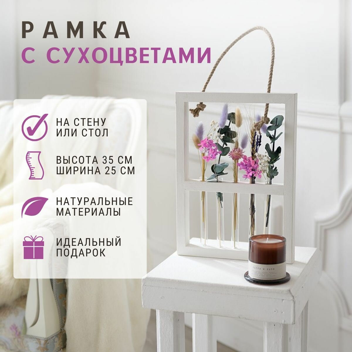 Вы ищите уникальный декор или подарок , хотите любоваться цветами круглый год, тогда наша рамка с сухоцветами Вам идеально подойдет! Можно использовать как панно настенное. Выполнена из массива сосны, что является экологичным материалом. Сухоцветы для декора не требуют ухода и долговечны. В составе: рамка, покрытая маслом, стабилизированные и высушенные цветы, долговечные, прослужит вам до 5 лет. Размеры рамки 35*25см, глубина 4 см . Сухоцветы в 5 пробирках, высота 16см, диаметр 1,5 см. Вы можете заменить их на любые живые цветы, например розы, тем самым легко преобразить дизайн под любое настроение, праздник или время года и использовать как вазу. Панно можно подвесить на стену с помощью джутовой верёвки, а также просто поставить, что придает вариативность в ее использовании. панно с сухоцветами прекрасная и оригинальная альтернатива постерам. Поставляется в картонной коробке, в воздушно-пузырчатой пленке, отмечена манипуляционными знаками, что гарантирует вам сохранность при доставке.