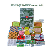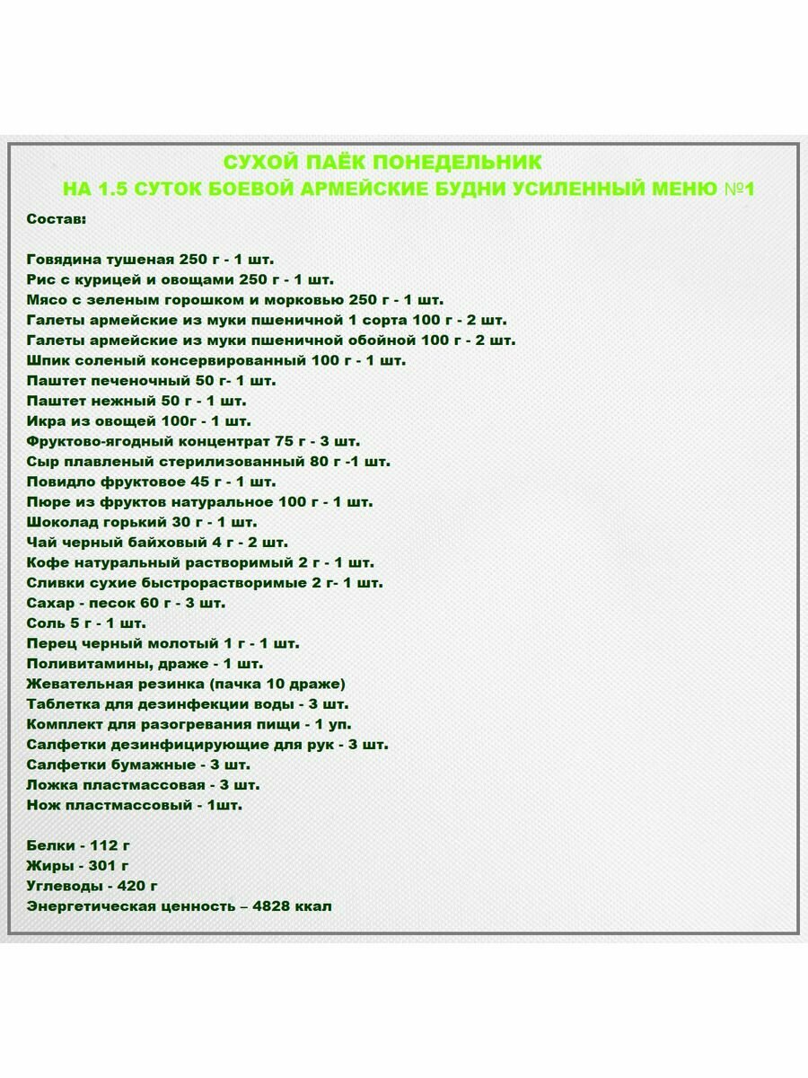 Товар имеет Сертификат Соответствия требованиям госта. Вес набора составляет 2,1 кг. Представляю вашему вниманию сухой паек "понедельник" – надежное и практичное решение для всех, кто ценит комфорт и независимость в путешествиях, туристических походах или экстремальных условиях. Этот сухпаек, разработанный специально для военных и армии, станет незаменимым помощником для обеспечения вашего питания в любых экстремальных ситуациях. Сухпай "понедельник" – это индивидуальный рацион питания, который содержит все необходимые питательные вещества и калории для полноценного питания в течение суток. Все компоненты тщательно отбираются и упаковываются таким образом, чтобы сохранить свежесть и целостность продуктов. Суточный сухпаек "понедельник" имеет простую систему приготовления: достаточно добавить горячую воду, подождать несколько минут и ваше вкусное и сытное блюдо готово к употреблению. Благодаря удобной упаковке, вы можете взять с собой необходимое количество сухпайков и быть уверенными в их долговечности и сохранности. Наш сухпай отличается не только высоким качеством и питательной ценностью, но и удобством использования. Он компактен, легок в транспортировке и не требует особых условий хранения. Благодаря этому, вы можете брать его с собой в любые поездки, путешествия или использовать в случае чрезвычайных ситуаций. Не откладывайте заботу о вашем питании на потом – приобретайте сухой паек "понедельник" и будьте уверены в своей независимости и комфорте в любых условиях. Мы гарантируем высокое качество продукта и полное удовлетворение ваших потребностей. Состав: говядина тушеная 1 шт, рис с курицей и овощами 1 шт, мясо с зеленым горошком и морковью 1 шт, бекон армейский 1 шт, паштет печеночный 1 шт, паштет нежный 1 шт, икра из овощей 1 шт, галеты армейские из муки пшеничной 1 сорта 2 шт, галеты армейские из муки пшеничной обойной 2 шт, фруктово-ягодный концентрат 3 шт, сыр плавленый стерилизованный 1 шт, повидло фруктовое 1 шт, пюре из фруктов натуральное 1 шт, шоколад горький 1 шт, чай черный байховый 2 шт, кофе натуральный растворимый 1 шт, сливки сухие быстрорастворимые 1 шт, сахар 3 шт, соль 1 шт, перец 1 шт, поливитамины драже 1 шт, жевательная резинка (пачка 10 драже) , таблетка для дезинфекции воды З шт, салфетки дезинфицирующие для рук З шт, салфетки бумажные З шт, ложка пластмассовая З шт, нож пластмассовый 1шт.
