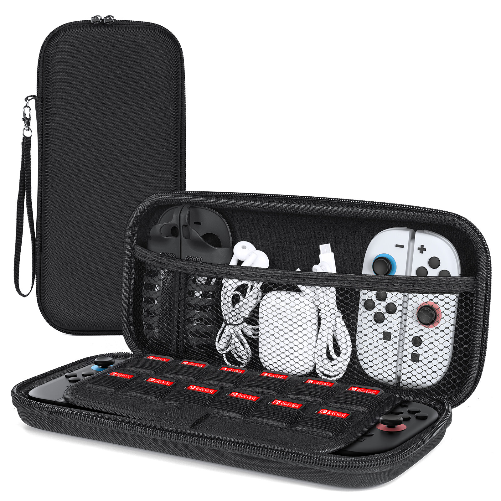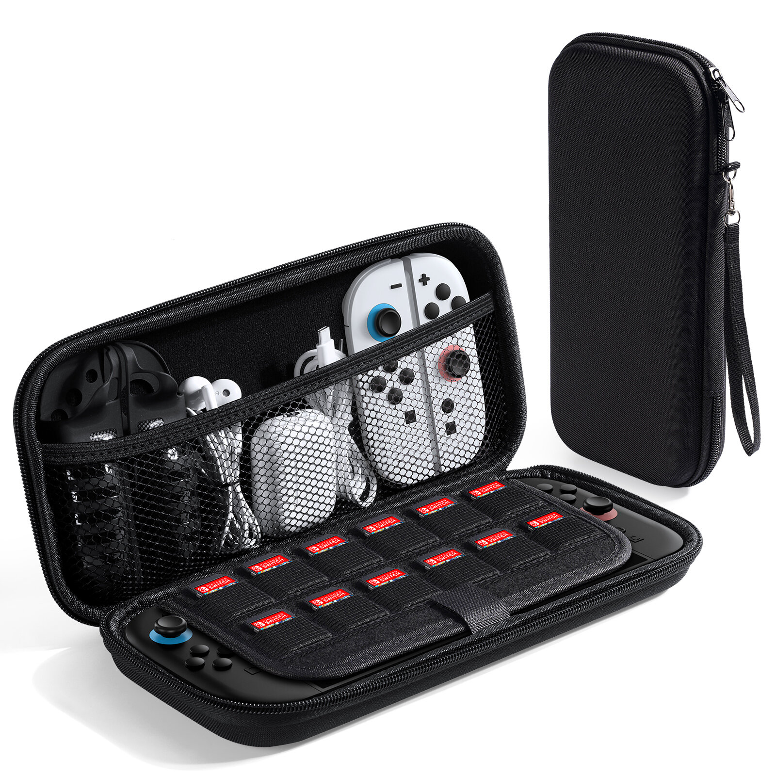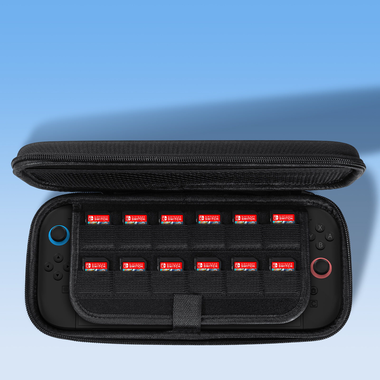 Сумка черного цвета от Dux Ducis для хранения приставки Nintendo Switch 2. Водонепроницаемая ткань Oxford + высокопрочный корпус EVA + мягкая бархатная подкладка. Тонкий профиль толщиной 45 мм для удобного хранения в рюкзаке, двухслойная защита (ударостойкая внешняя часть + мягкая внутренняя часть). Не требуется разборка, идеально подходит для Switch 2 с прикрепленными корпусами/контроллерами. Включает встроенный ремень, двойные молнии и липучку для безопасности во время путешествий.