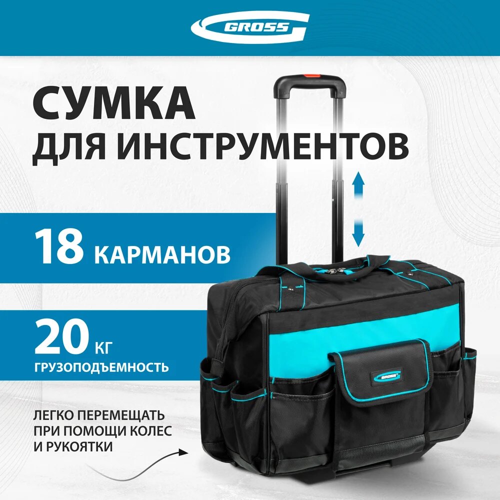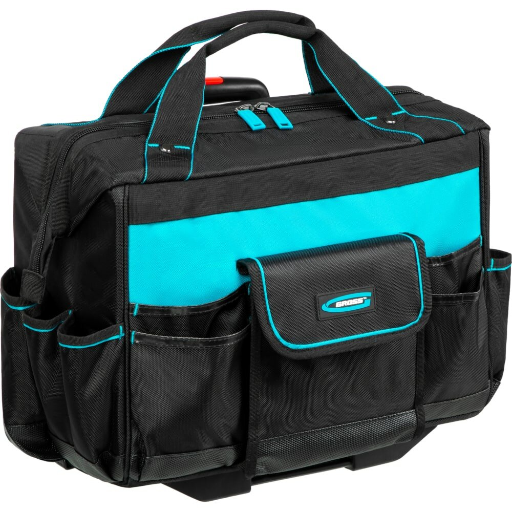 Сумка Gross 90277 размером 460 х 240 х 340 мм, с выдвижной рукояткой и колесами, имеет 18 карманов и вместительное основное отделение, в которые можно сложить необходимый ручной и электроинструмент. Сумка пригодится дома, в гараже и в поездке.