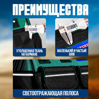 Строительная сумка имеет прочную каркасную конструкцию с жестким дном и непромокаемым материалом oxford, что обеспечивает дополнительную защиту от влаги и пыли. Благодаря вместительному отделению и карманам (14 штук), все необходимые инструменты всегда будут в порядке и под рукой, будь то на стройке, мастерской или в багажнике машины. Каждый карман специально разработан для удобного доступа к вещам и имеет замок на липучке.