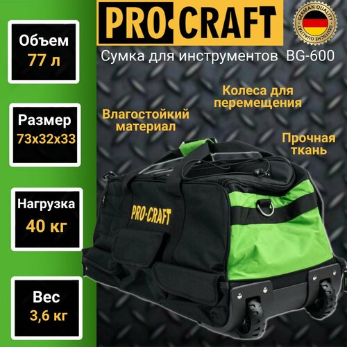Купить Сумка для инструментов влагостойкая на колесах ProCraft BG-600, 73x32x33 см, до 40кг, 77л с доставкой по всей России. Сумка для инструментов влагостойкая на колесах ProCraft BG-600, 73x32x33 см, до 40кг, 77л: сравнение цен, характеристики, фото, актуальное наличие и цены.