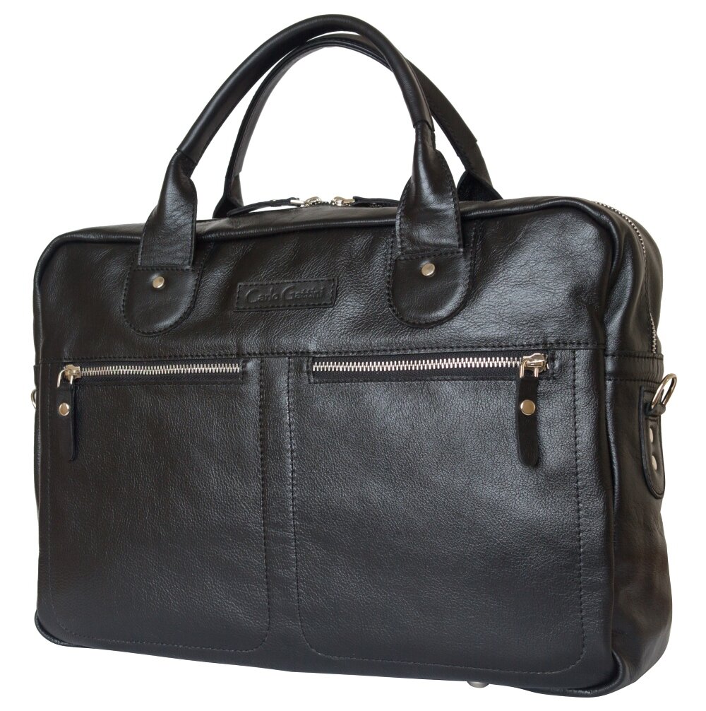Кожаная сумка для ноутбука Carlo Gattini Fratello (Фрателло) выполнена из натуральной кожи черного цвета. Состоит из основного отделения на молнии, внутри которого есть 3 открытых небольших кармашка и съемная перегородка для ноутбука с диагональю до 14 дюймов. На задней стенке: карман на молнии. На передней: два кармана на молнии Сумка выполнена без тканевого подклада, все внутреннее пространство отделано натуральной кожей. Молнии металлические. В комплекте есть съемный кожаный наплечный ремень. Видеобзор сумки: