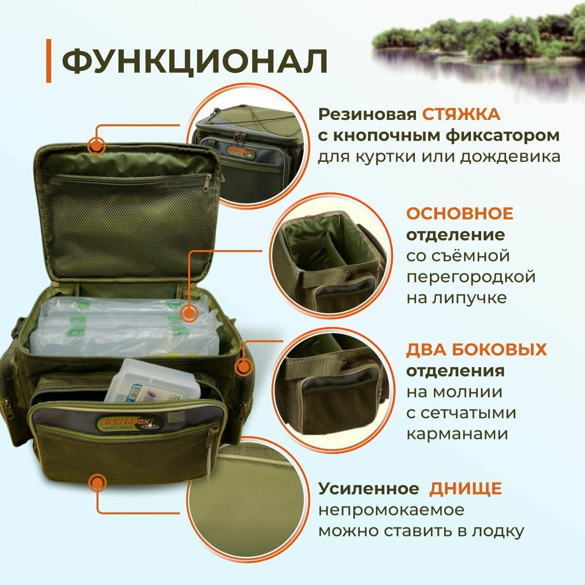 Удобная наплечная сумка для рыбалки. В основном отделении размещены три пластиковых коробки FisherBox 310 для приманок. Также в основном отделении присутствует съемная неполная перегородка с возможностью регулировки положения. В крышке основного отделения находятся внутренний карман на молнии в виде сетки и внешний карман на молнии для документов. Спереди сумки размещен карман на молнии с коробкой FisherBox 216 с внешним карманом на молнии в виде сетки. Два вместительных кармана на молнии по бокам сумки с нашитыми на них сетчатыми карманами. Непромокаемое дно. Регулируемый по длине плечевой ремень.