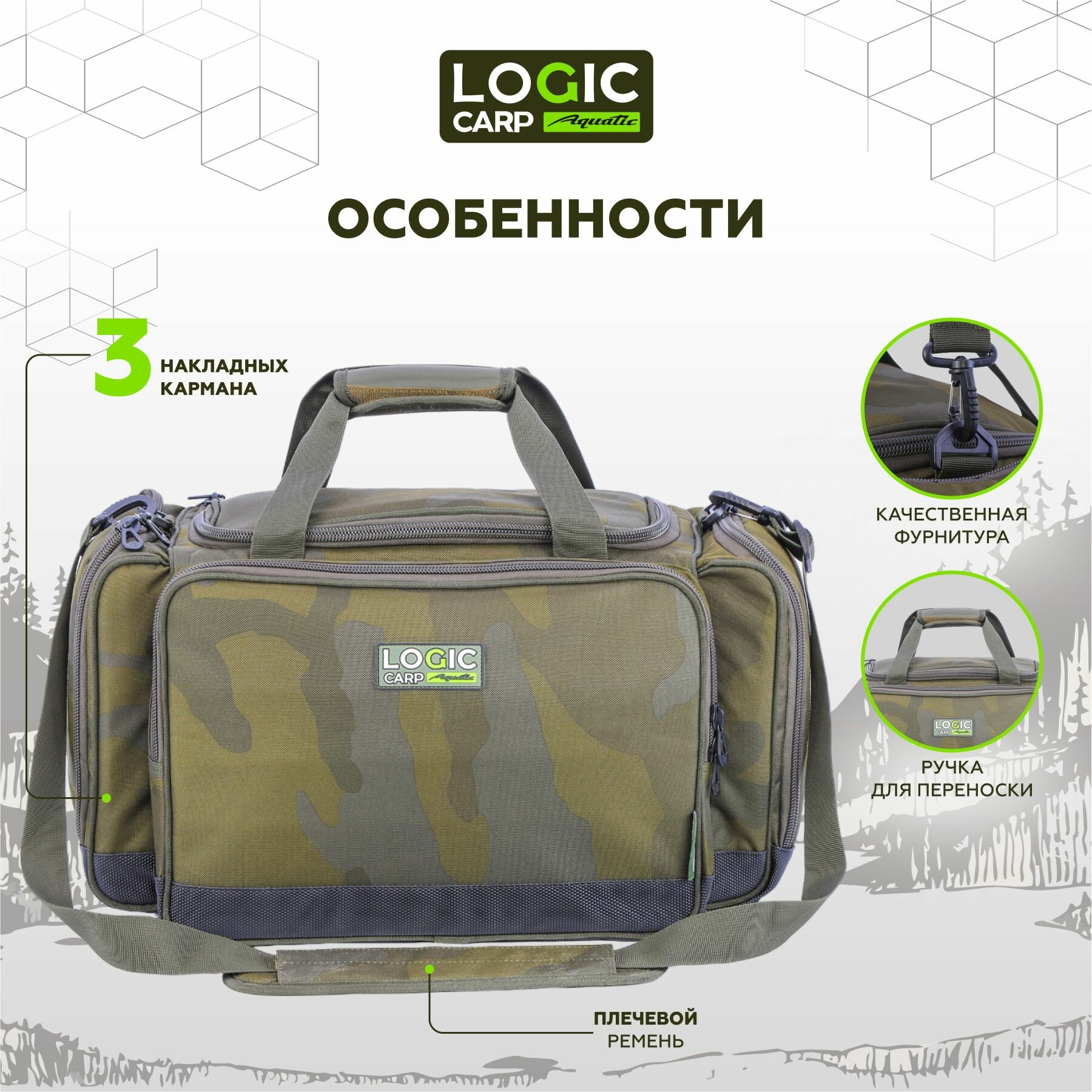 Logic Carp LC-B38 – стильная и функциональная рыболовная сумка бренда Aquatic объемом 38 литров для транспортировки снаряжения и рыболовных принадлежностей. Она поможет аккуратно расположить ваши вещи и станет верным спутником для любых поездок и путешествий, летней и зимней рыбалки, охоты, кемпинга, туризма. Износостойкий материал и надежная фурнитура гарантируют, что эта сумка прослужит долгие годы и не подведет даже в экстремальных ситуациях. Модель отличается жестким корпусом и усиленным дном из ПВХ, что обеспечивает защиту содержимого от механических повреждений и случайных падений при перевозке. Сумку можно положить в багажник автомобиля среди других вещей или спокойно сдать в багаж во время авиаперелета. Продуманная эргономика позволяет легко расположить все принадлежности, аксессуары, предусмотрены 3 накладных кармана для хранения и более удобной организации инвентаря рыбака, охотника или путешественника. Кроме того, имеется крепление органайзер для аксессуаров и просторный карман на крышке. Боковые карманы на молнии полностью распахиваются для быстрого доступа к содержимому. Для транспортировки имеются надежные ручки и плечевой ремень, который при необходимости можно снять. Это позволяет носить сумочку как в руках, так и на ремне через плечо в зависимости от ситуации. Сумка выполненная в стильном современном дизайне это подарок, который придется по вкусу большинству рыболовов, охотников, туристов. Материал: Полиэстер, ПВХ, вспененный полиэтилен Объем: 38 л Вес: 1250 гр Габаритные размеры: 52х35х30 см Размеры основного отделения: 37х27х27 см Размеры 2-х боковых карманов: 25х25х5 см Размеры переднего кармана: 38х25х5 см Артикул: LC-B38