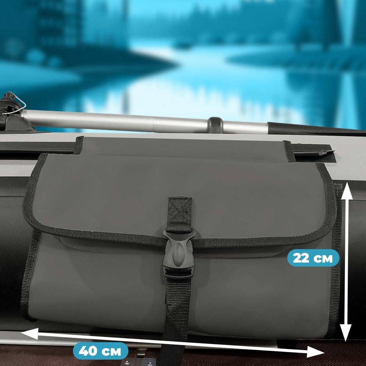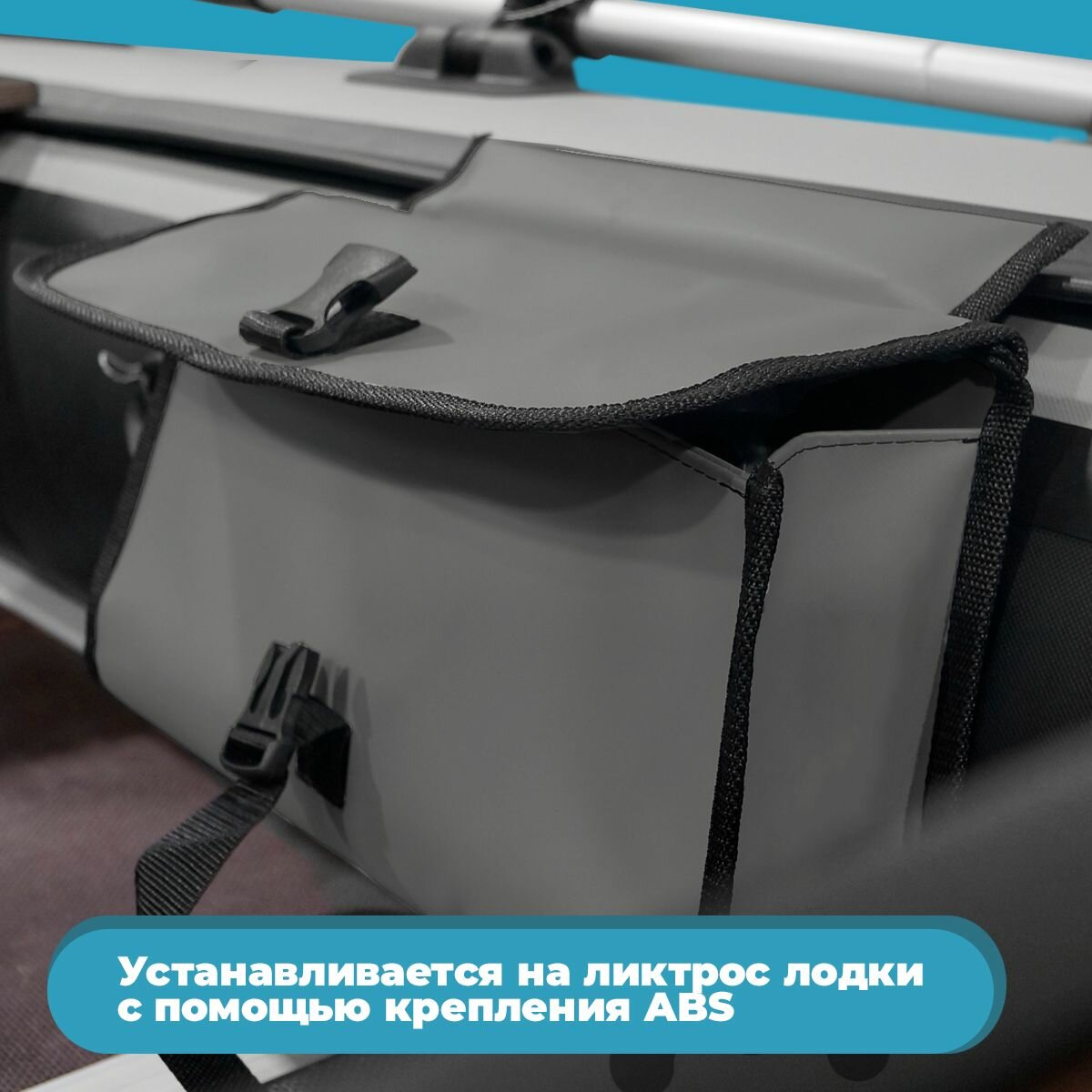 Крепится на ликтрос надувной лодки на крепления ABS. В заднюю часть сумки для большей жесткости проложен двойной слой ПВХ. Удобна для рационального использования свободного места в лодке.