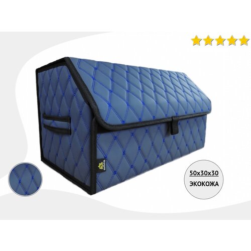 Универсальная сумка-органайзер Autozoom в багажник - подходит абсолютно для любой модели автомобиля! Сумка-саквояж автомобильная изготовлена из качественной синей экокожи премиум-класса: она не деформируется, легко чистится и станет отличным дополнением к интерьеру салона автомобиля. Автомобильный кофр продается в разобранном виде и собирается за пару минут! Размеры в собранном виде 50х30х30см. В комплект органайзера для автомобиля входит перегородка, разделяющая сумку-органайзер на два отделения. Вместе с органайзером Автозум Вы забудете о беспорядке в машине, так как короб для хранения способен вместить в себя аптечку, огнетушитель, набор инструментов, масло, незамерзайку и многое другое. Сохранит чистоту и порядок в багажнике вашего авто!