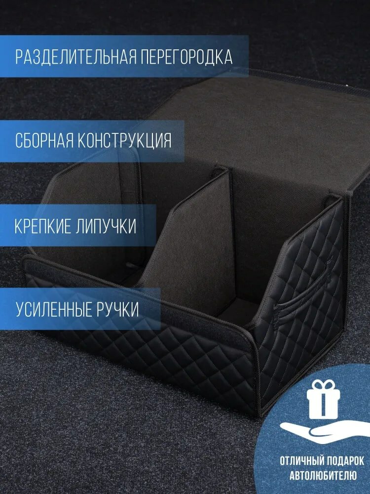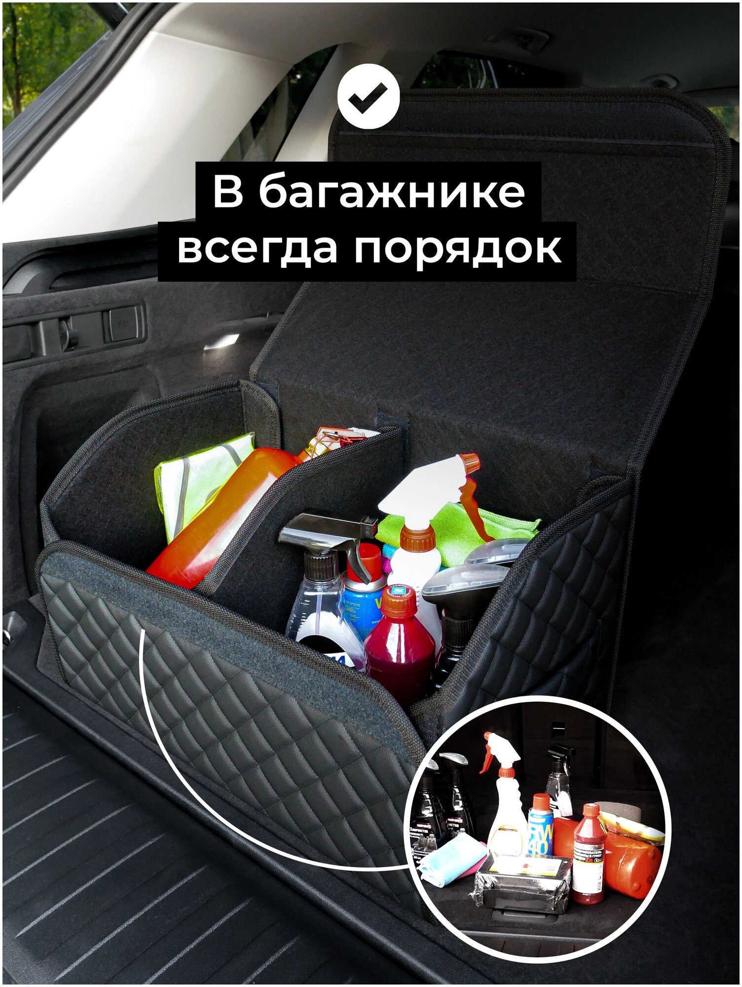 Органайзер в багажник автомобиля – это практичное изделие, в котором можно хранить личные вещи. Саквояж в багажник автомобиля изготовлен из ЭКО кожи будет отличным подарком не только мужчинам на 23 февраля, но и прекрасным женщинам на 8 марта или на любые другие праздники для автомобилиста , такие как день рождения или просто так. Во время поездки на автомобиле нужно подумать, где положить аптечку, лекарства, инструменты и другие компактные предметы. Материал автотовара влагоустойчивый, не трескается при перепаде температур, износостойкий и легко чистится. Отлично держит форму. В нашем ящике для авто предусмотрены крепкие ручки по бокам изделия, за которые удобно его переносить. Автоаксессуар не занимает много места в багажнике автомобиля, а благодаря лаконичному дизайну подойдет для любого автомобиля. В дорожном оргонайзере 2 отделения (в комплекте идет перегородка, убрав которую, вы получите одно большое отделение), крышка прочно фиксируется липучкой. Не стоит бояться за целостность автобокса при его падении – он выдержит самые сильные механические удары. Наш органайзер для путешествий более удобный и практичный в отличие ящика в машину, который выглядит слишком громоздким, его неудобно носить с собой. К тому же, использование тяжелых предметов вредно доя багажника – он будет поддаваться лишней нагрузке, что непременно приведет к ухудшению качества поверхности, на ней образуются вмятины и потертости!