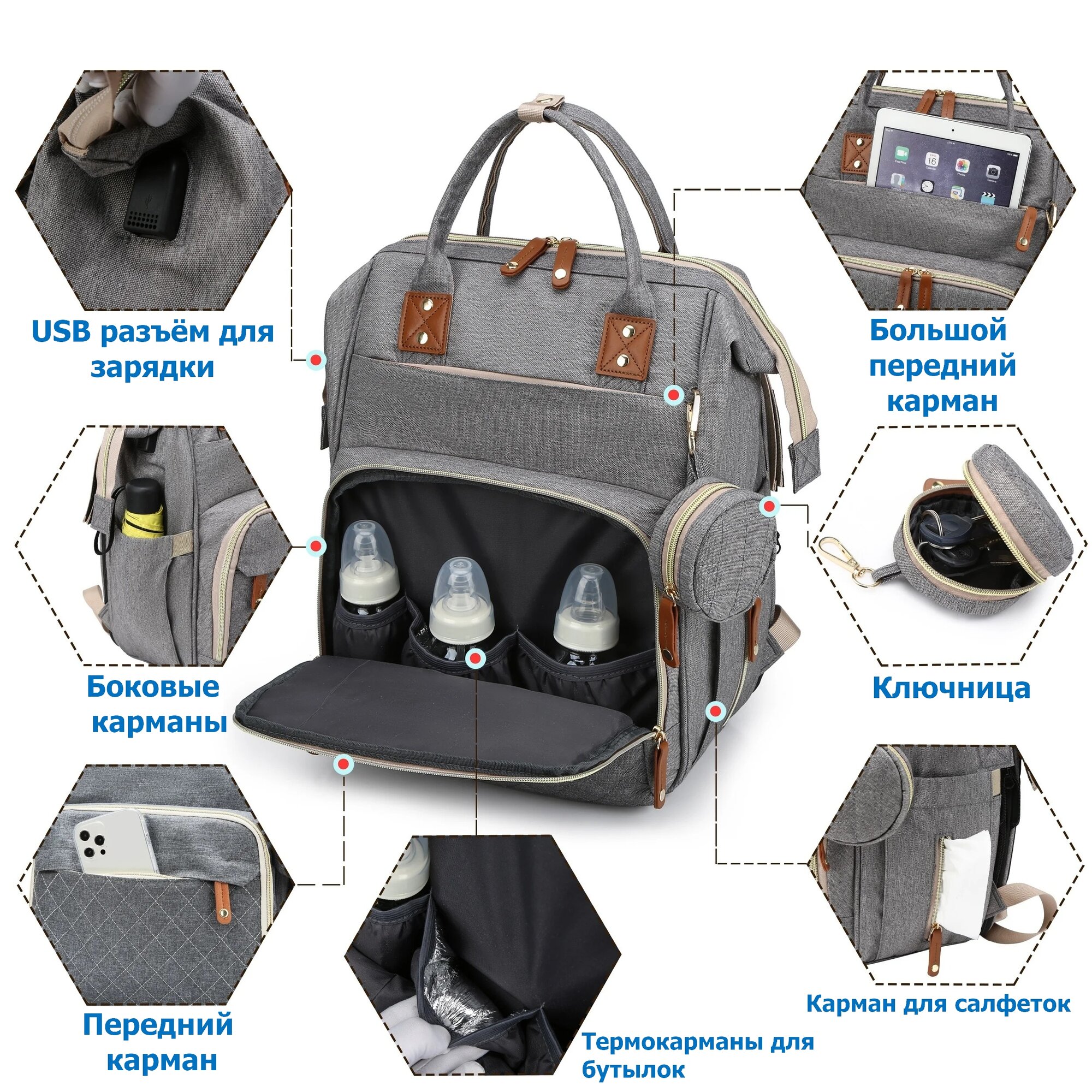 В такой сумке можно носить с собой подгузники, детские игрушки, погремушки, питание, бутылочки и многое-многое другое, что может срочно понадобиться ребенку во время прогулки на свежем воздухе, во время поездки или путешествия.