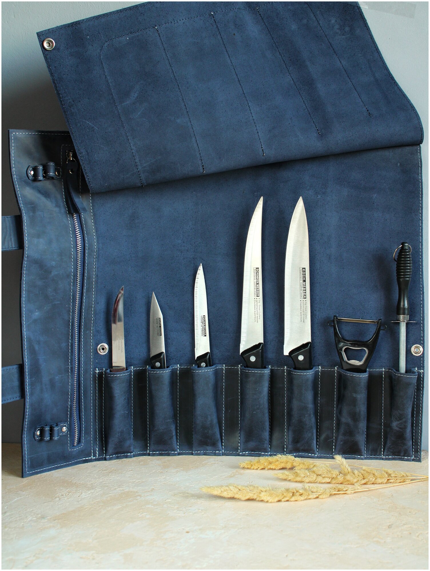Сумка поварская для ножей из натуральной кожи крейзи хорс (натуральная кожа крупного рогатого скота повышенной плотности, которую получают путем нанесения карнаубского тугоплавкого воска на специально шлифованный краст хромового дубления (от англ. «crust» — кора — вид кожи с естественным рисунком) и финишной обработки «Crazy Horse». Отличительная внешняя особенность этой кожи – винтажность. На ней легко остаются царапины, следы, если ее зацепить чем-то твердым. Но это главный и плюс этой кожи, т. к. придают ей особый шарм «старины», и со временем каждое изделие приобретает свой, эксклюзивный внешний вид) итальянского производства. Отлично подойдет поварам, охотникам, туристам, рыболовам. Скрутка для ножей закрывается клапаном, который закрывает лезвия ножей, сама скрутка застёгивается пряжками, внутри один карман на молнии, 7 карманов для ножей между карманами имеются небольшие карманы для пинцетов, мусата и т. д. Размеры в разложенном состоянии: 52 см х 41 см. Собственное производство, ручная работа. Качественная натуральная кожа и фурнитура. Скрутки для ножей / подарок повару / чехол для ножа / подарок.