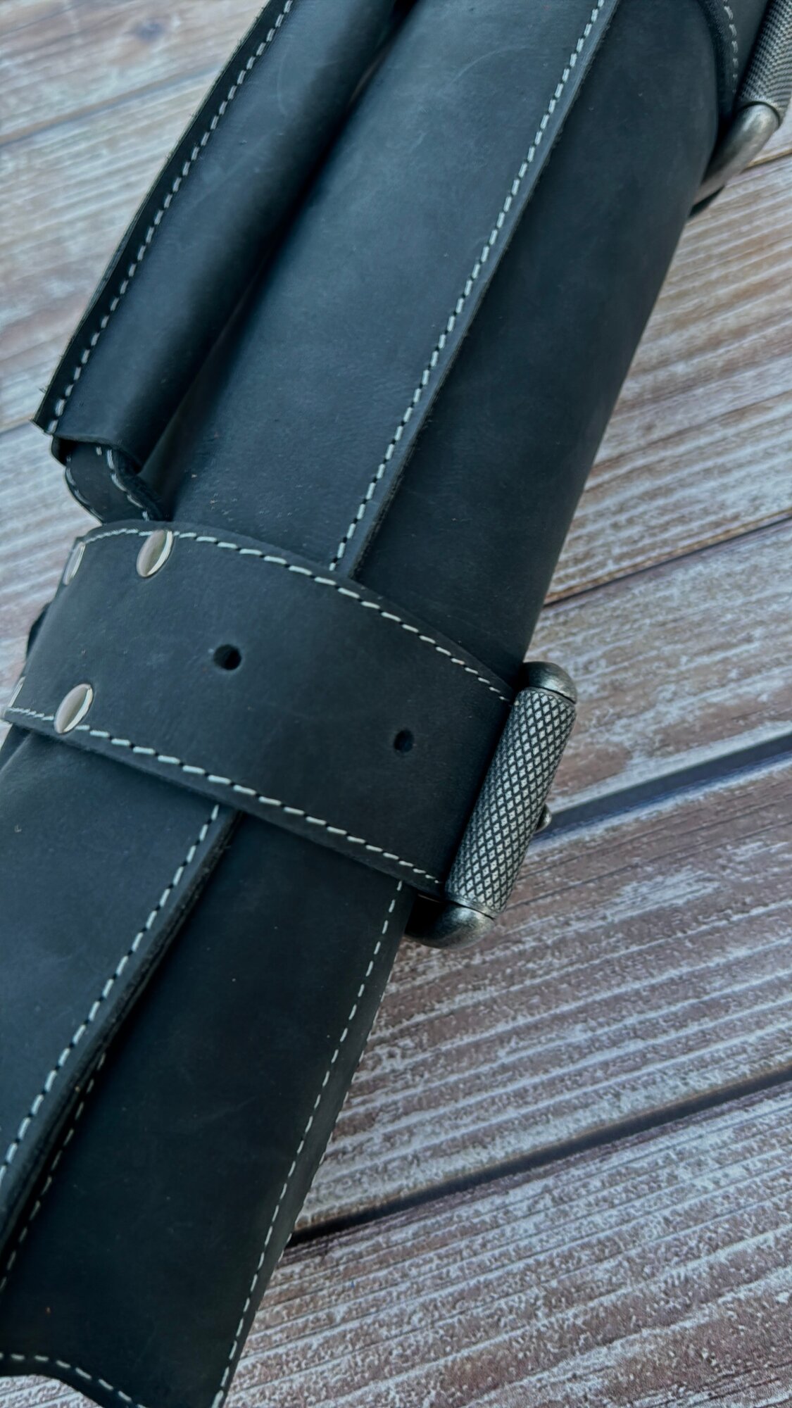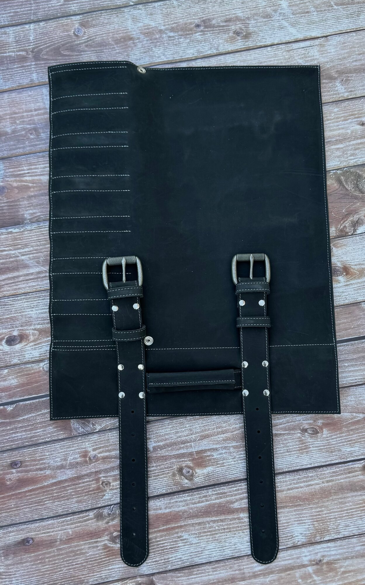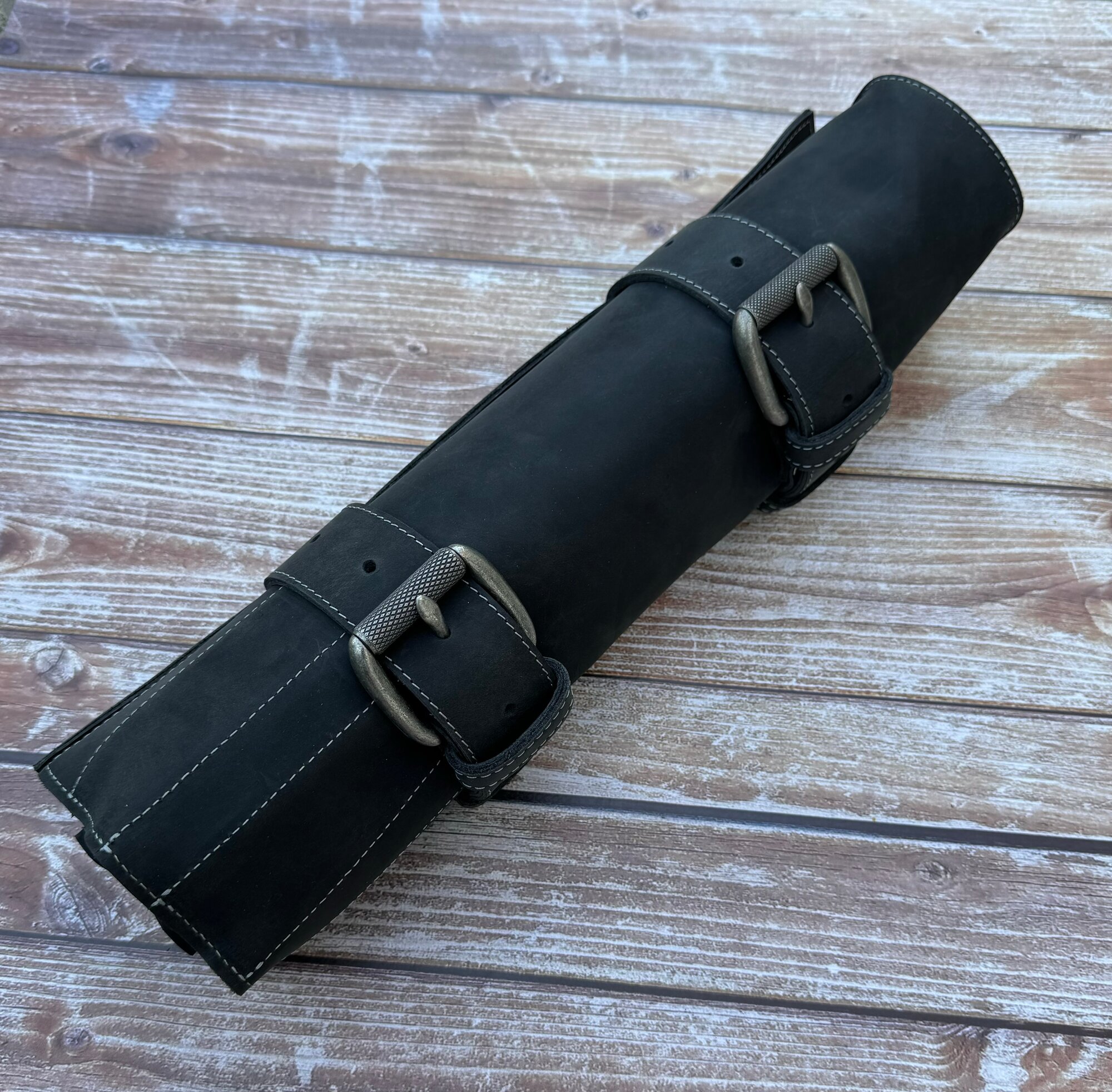 Сумка поварская для ножей из натуральной кожи (натуральная кожа крупного рогатого скота). Отлично подойдет поварам, охотникам, туристам, рыболовам. Скрутка для ножей закрывается клапаном, который закрывает лезвия ножей, сама скрутка застёгивается пряжками, внутри один карман на молнии, 7 карманов для ножей между карманами имеются небольшие карманы для пинцетов, мусата и т. д. Размеры в разложенном состоянии: 52 см х 41 см. Собственное производство, ручная работа. Качественная натуральная кожа и фурнитура. Скрутки для ножей / подарок повару / чехол для ножа / подарок.