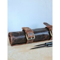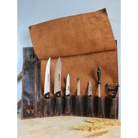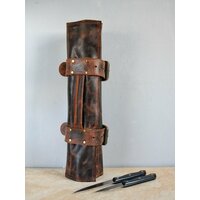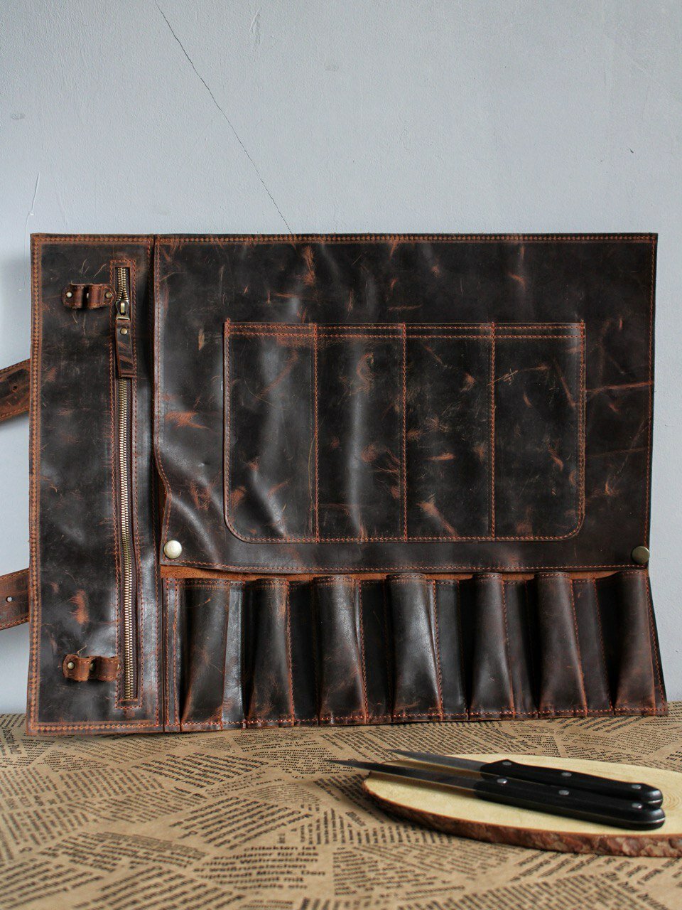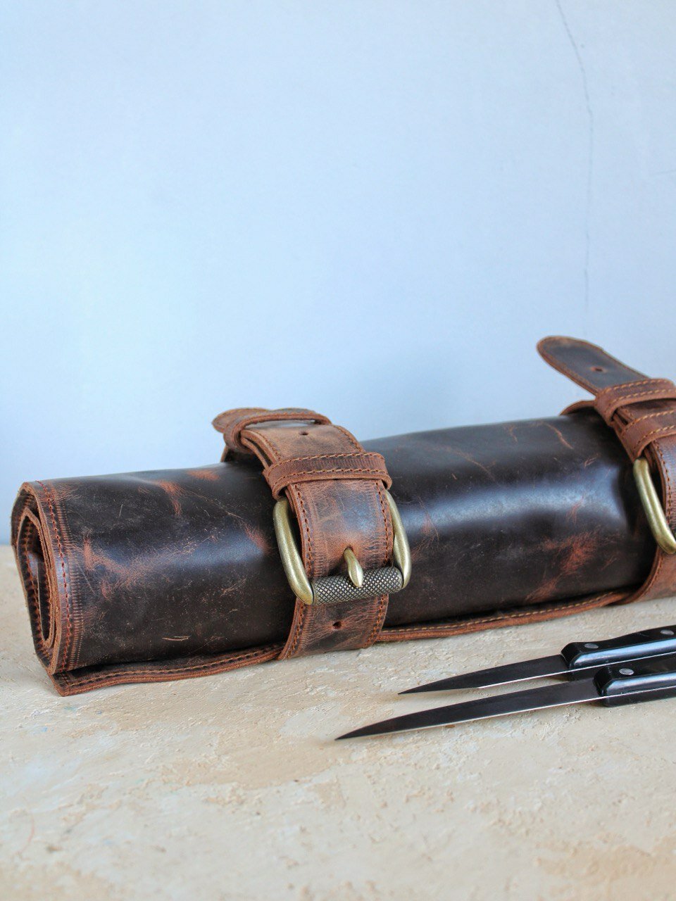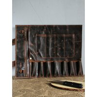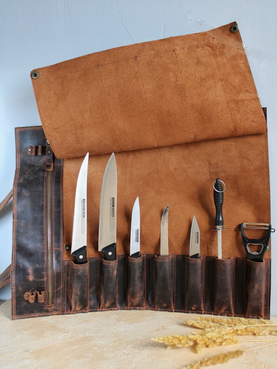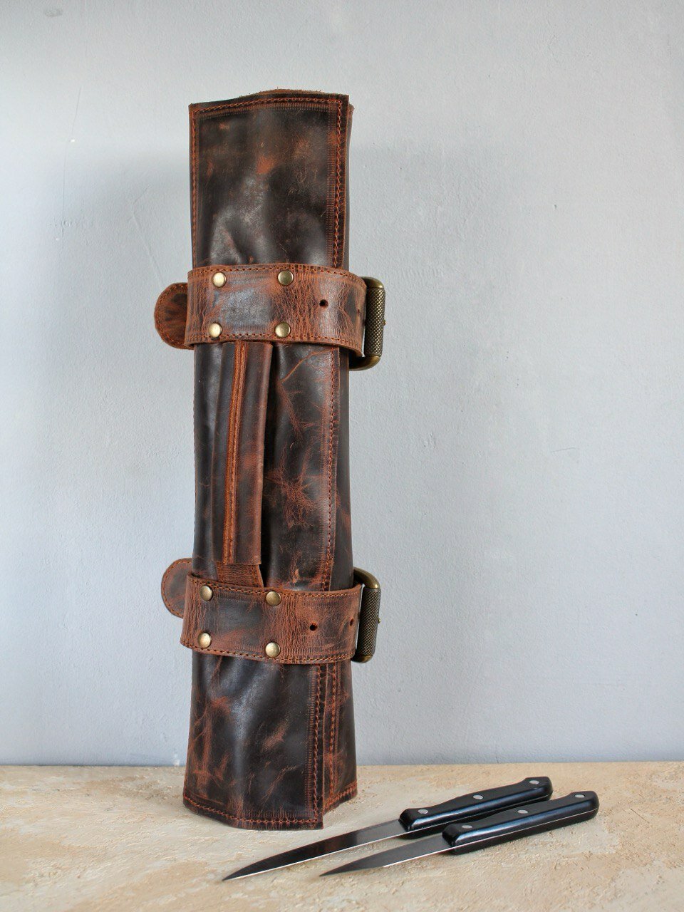 Сумка поварская для ножей из натуральной кожи крейзи хорс (натуральная кожа крупного рогатого скота повышенной плотности, которую получают путем нанесения карнаубского тугоплавкого воска на специально шлифованный краст хромового дубления (от англ. «crust» — кора — вид кожи с естественным рисунком) и финишной обработки «Crazy Horse».Отличительная внешняя особенность этой кожи – винтажность. На ней легко остаются царапины, следы, если ее зацепить чем-то твердым. Но это главный и плюс этой кожи, т.к. придают ей особый шарм «старины», и со временем каждое изделие приобретает свой, эксклюзивный внешний вид) итальянского производства. Отлично подойдет поварам, охотникам, туристам, рыболовам. Скрутка для ножей закрывается клапаном, который закрывает лезвия ножей, сама скрутка застёгивается пряжками, внутри один карман на молнии, 7 карманов для ножей между карманами имеются небольшие карманы для пинцетов, мусата и т.д. Размеры в разложенном состоянии: 52 см х 41 см. Собственное производство, ручная работа. Качественная натуральная кожа и фурнитура.Скрутки для ножей / подарок повару / чехол для ножа / подарок.