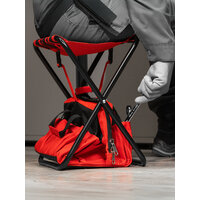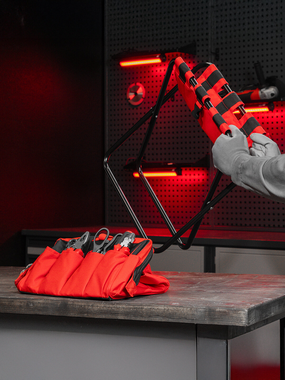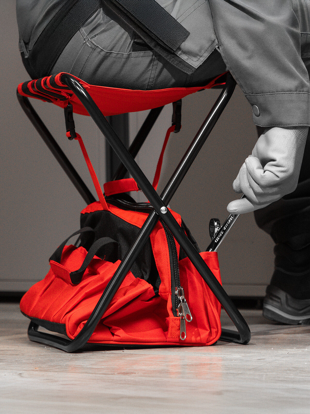 - Многофункциональность — складной стул комплектуется сумкой с вместительным основным отделением и большим количеством карманов, в которых поместятся все необходимые инструменты.