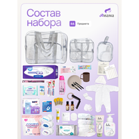 Комплектация набора продумана до мелочей. В нем вы найдете все необходимое для комфортного пребывания в роддоме: от подгузников и косметики до пеленок и одноразовых покрытий на сиденье унитаза.