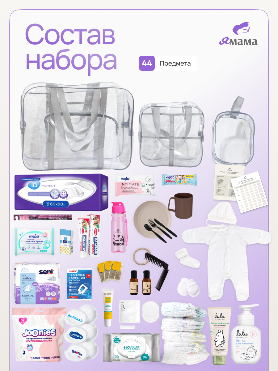 Сумка в роддом "Я Мама" - это готовый набор для мамы и малыша, включающий в себя 44 предмета.