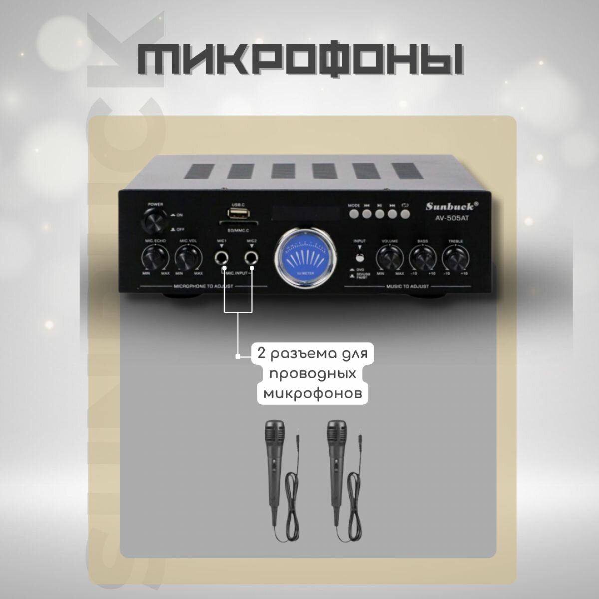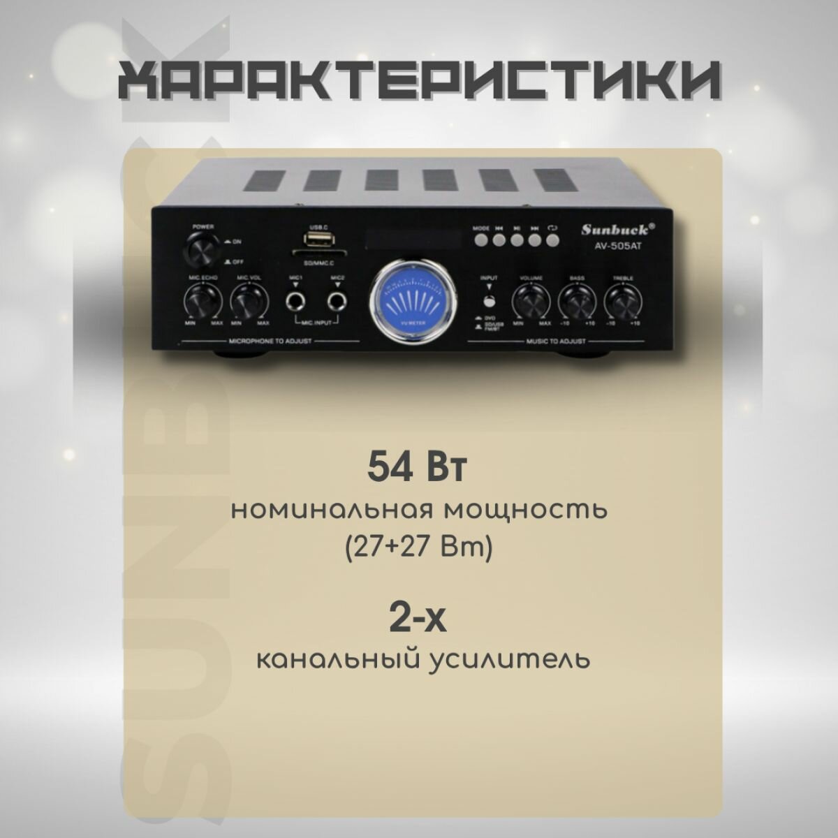 Купить Sunbuck усилитель AV-505AT, Bluetooth 5.0, 27 Вт RMS, караоке, FM-радио, USB, Hi-Fi, VU-метр с доставкой по всей России.
