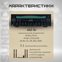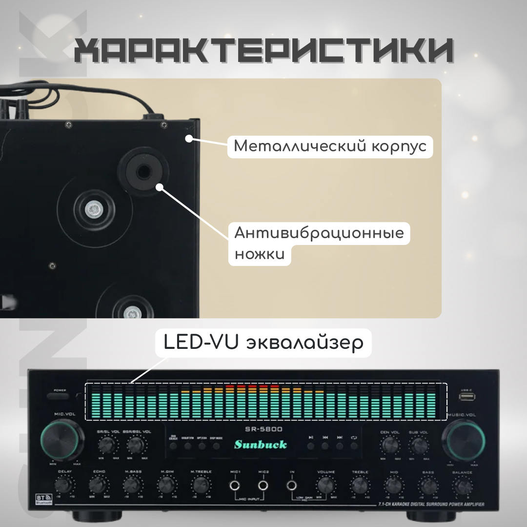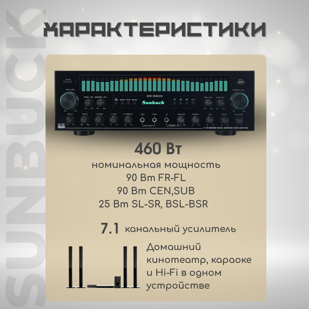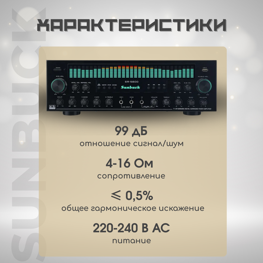 Усилитель Sunbuck SR-5800 представляет собой полноформатный 7.1-канальный цифровой усилитель, работающий от сети 220 В. В одном корпусе вы получаете мощный усилитель для домашнего кинотеатра 7.1, караоке-усилитель с тремя микрофонами, усилитель Bluetooth 3.1 (караоке усилитель bluetooth) и USB MP3-плеер, а также поддержку оптического и коаксиального входов. Устройство рассчитано на акустику 4–16 Ом, рекомендованный диапазон динамиков – от 5″ до 12″, что делает его идеальным и как усилитель для музыки и караоке дома, и как профессиональное решение для баров, кафе или вечеринок.
