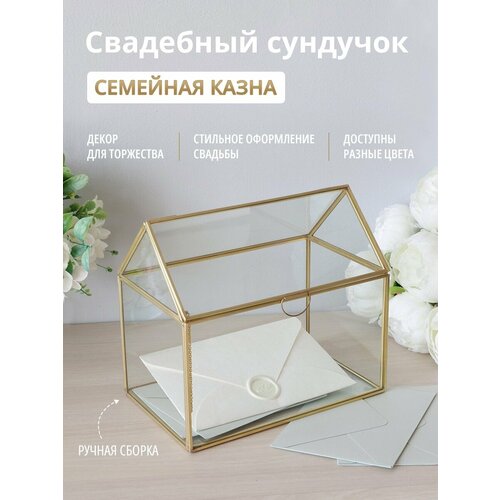 Шкатулка для конвертов (под золото). Стекло, металлический профиль, ручная сборка. Если вам нужно стильно оформить свадьбу или День рождения - эта шкатулка отлично дополнит декор торжества.- Но это еще не все, ее стильный дизайн будет гармонично вписываться в любой интерьер. Открывается один скат "крыши", для фиксации дополнен цепочкой в цвет металлического профиля. Упаковка: транспортировочная коробка из гофрокартона. При получении продукции из стекла в ПВЗ или у курьера проверяйте все стеклянные изделия на целостность. Изделие не должно быть со сколами, трещинами, царапинами или разбито. В противном случае претензии на возврат приниматься не будут.