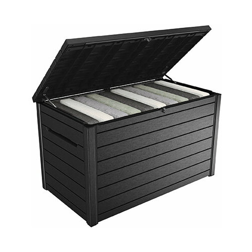 Сундук Keter Ontario Storage box графит выполнен под дерево и рассчитан на уличное хранение. Он не требует покраски и легко собирается, что делает его удобным для использования в любых погодных условиях.
