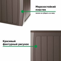 Ящик для хранения вещей изготовлен из высококачественного пластика стойкого к перепадам температур и ультрафиолетовому излучению. Он не гниет и не ржавеет, долго не выцветает на солнце, не требует покраски и его можно не убирать на зиму в помещение.