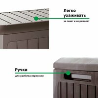 Благодаря продуманной конструкции садовый сундук не боится осадков и сохраняет сухими находящиеся в нем вещи. А наличие колес и ручек по бокам позволяет легко переместить его с места на место.