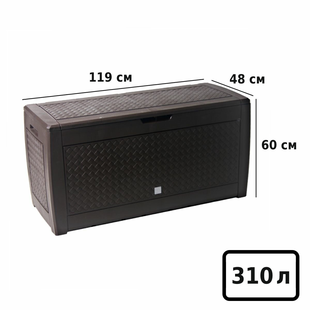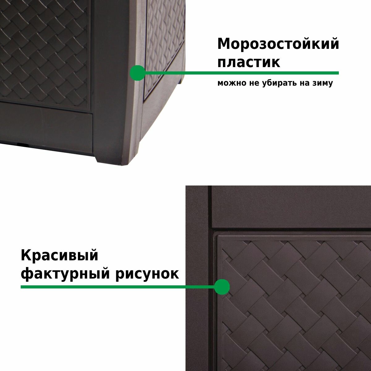 Ящик для хранения вещей изготовлен из высококачественного пластика стойкого к перепадам температур и ультрафиолетовому излучению. Он не гниет и не ржавеет, долго не выцветает на солнце, не требует покраски и его можно не убирать на зиму в помещение.