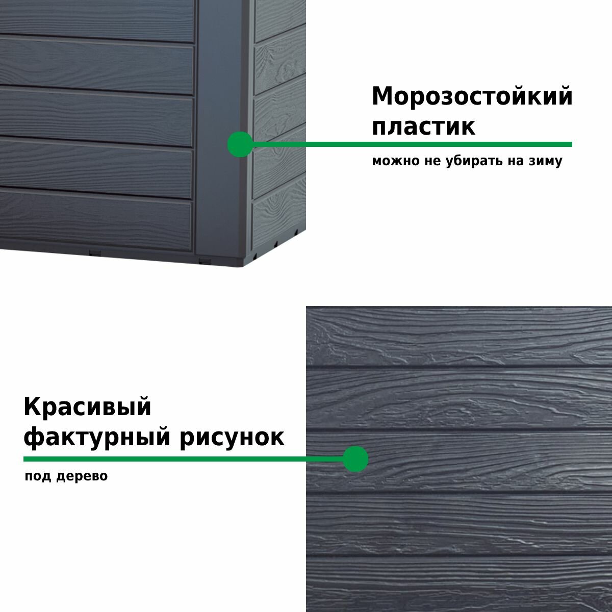 Ящик для хранения вещей изготовлен из высококачественного пластика стойкого к перепадам температур и ультрафиолетовому излучению. Он не гниет и не ржавеет, долго не выцветает на солнце, не требует покраски и его можно не убирать на зиму в помещение.