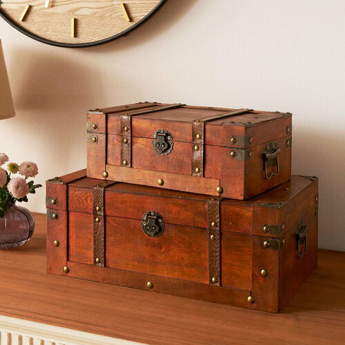 Сундуки выполнены под старину из дерева и покрыты лаком приятного коричневого цвета. Филигранные замочки и фурнитура, боковые ручки для переноски. Декоративные ремни из искусственной кожи. Размеры: 30 х 18 х 11 см и 40 х 24 х 16 см. В комплекте 2 штуки.