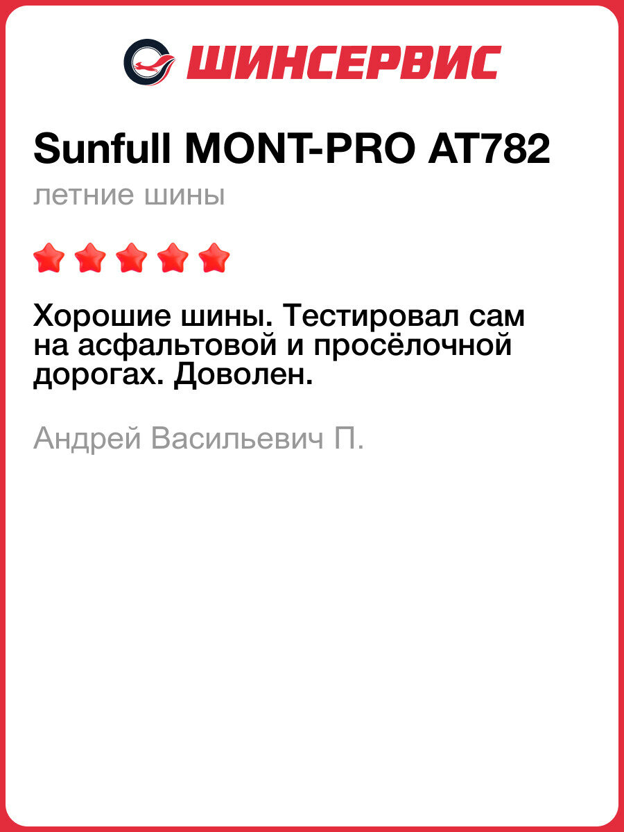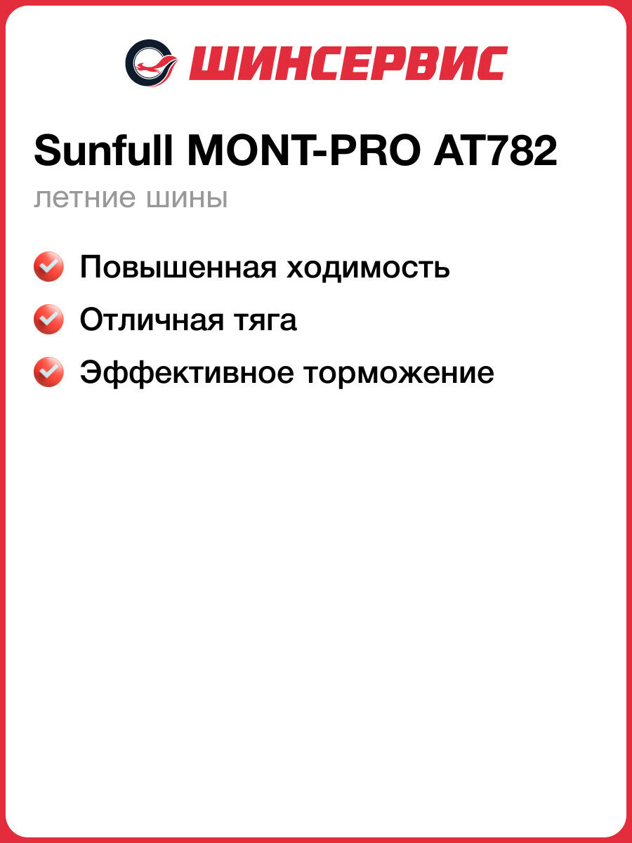 Купить Летняя шина Sunfull MONT-PRO AT782 265/70 R16 112T с доставкой по всей России. Летняя шина Sunfull MONT-PRO AT782 265/70 R16 112T: сравнение цен, характеристики, фото, актуальное наличие и цены.