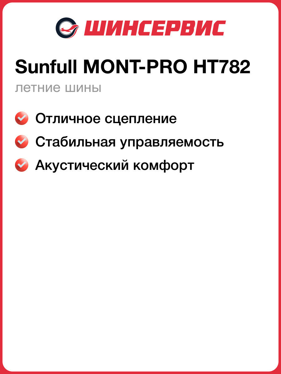 Купить Шины летние Sunfull MONT-PRO HT782 225/65/R17 102H без RunFlat Легкогрузо с доставкой по всей России. Шины летние Sunfull MONT-PRO HT782 225/65/R17 102H без RunFlat Легкогрузо: сравнение цен, характеристики, фото, актуальное наличие и цены.