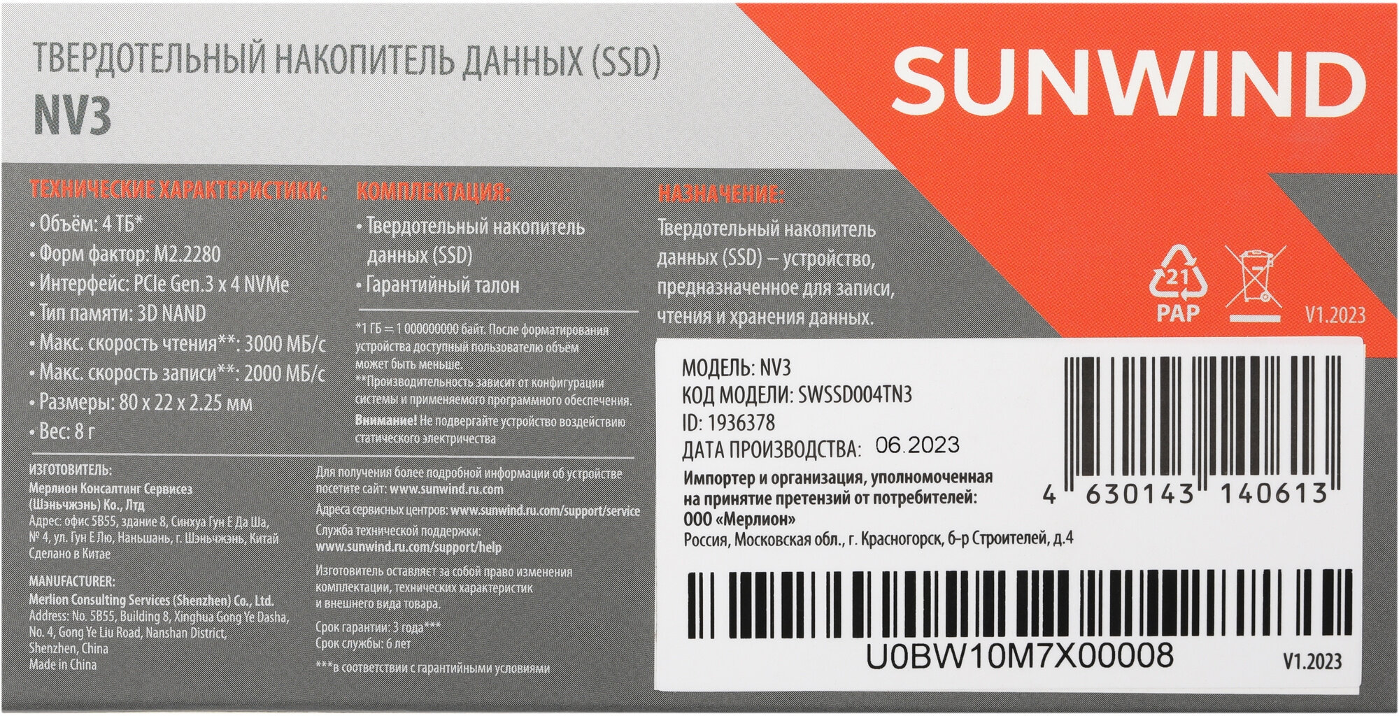 SUNWIND Накопитель SSD SunWind PCIe 3.0 x4 4TB SWSSD004TN3 NV3 M.2 2280 SWSSD004TN3: сравнение цен, характеристики, фото, актуальное наличие и цены.