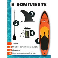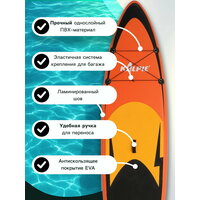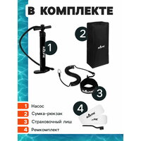 Прочное основное покрытие доски соединяется с камерой высокого давления путём ламинирования. Это высокотехнологичный процесс, который обеспечивает идеально ровную поверхность и точную толщину доски без перепадов. Технология DROP STITCH — камера состоит из тысяч переплетённых тонких волокон. Это придаёт жёсткость по всей длине доски. Увеличенная плотность пряжи обеспечивает высокую прочность на растяжение. Камера выдерживает давление до 20 фунтов на 1 квадратный дюйм. Количество нитей: 25 000 на м². Новая технология соединений в камере высокого давления — CROSS STITCH FUSION (вышивка крестом). На 30 % жёстче по сравнению с обычными однослойными камерами сапбордов. На 25 % легче по сравнению с устоявшейся технологией изготовления двойного слоя. Усиленный внешний слой канта обеспечивает дополнительную плотность и жёсткость каркаса. При боковом столкновении с твёрдым объектом в воде, например с камнем, доска не повредится. Воздухонепроницаемый внутренний слой канта — это ламинированный шов, который обеспечивает дополнительную герметичность камеры высокого давления и водонепроницаемость доски. Коврик из материала EVA с ромбовидным протектором обеспечивает идеальное комфортное сцепление с сапбордом. Оберегает от скольжения ног по доске. Запирающийся нажимной клапан с защитой от повреждений обеспечивает герметичность. Кнопочная система помогает без труда приспустить давление в доске нажатием на кнопку в клапане. Эластичная шнуровка в передней части — для закрепления и перевозки багажа на сапборде. Ручки в передней, центральной и задней частях — для переноски накачанной доски. Съёмный киль (плавник). Сумка-рюкзак — для переноски и хранения доски и аксессуаров. D-образное кольцо из нержавеющей стали — для крепления страховочного троса. 4 кольца из нержавеющей стали — для крепления сиденья. Однолопастное разборное весло с регулировкой высоты, состоящее из 3 частей.