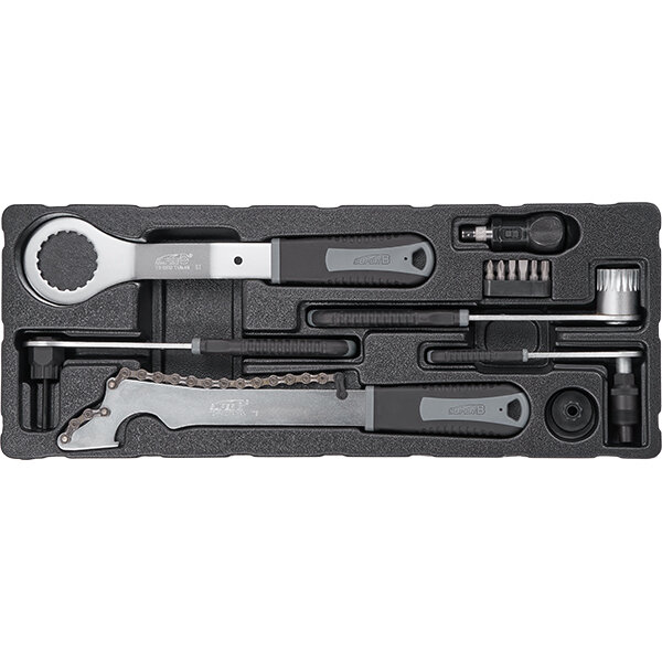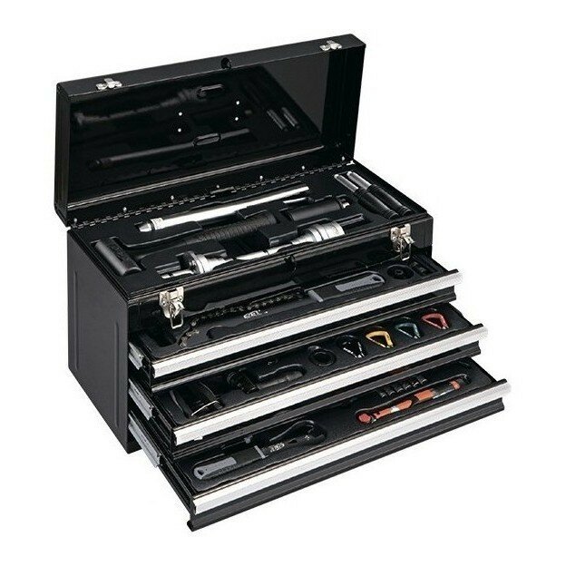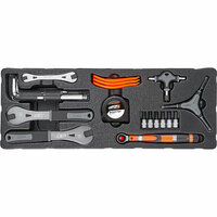 1-й уровень•1-Съемник чашек рулевой для 1", 1-1/8" и 1-1/4".•1-Киянка. •1-Инструмент для установки якоря 1" & 1-1/8". •1-Пресс для подшипников рулевой 1", 1-1/8", 1-1/4" и 1-1/2".2 уровень•6-25L биты в кассете: Phillips 1 / 2, шлицеввые 5 / 7 и T25 / T30. •1-Короткий гаечный ключ. •1-Ключ - хлыст и съемник звезд для 5 -10-скоростных кассет. •1-Ключ для кареток с внешними чашками 16 шлицов: Shimano® Hollowtech II, Truvativ® GXP, FSA® MegaExo, Campagnolo® Ultra-TorqueTM, TOKEN® и пр. •1-Съемник шатунов. •1-Ключ для картриджа каретки с направляющим пином для Shimano®, ISIS Drive® шлицевых 20Т, FSA®, Race Face® и Truvativ®, TOKEN®. •1-Съемник трещотки с направляющим пином для Shimano®, SunRace®, SRAM®, Chris King®, SunTour® и прочих аналогичных локрингов кассет. •1-2 в 1 съемник шатунов под квадрат, шлицевых осей Shimano® octalink и ISIS Drive®.3 уровень•1-Профессиональный педальный ключ 15 мм. •1-Многофункциональный педальный ключ 15 мм с 14 / 15 мм торцевыми ключами. •1-2 в 1 измеритель износа и стяжка цепи. •1-Профессиональные кусачки для тросиков и оплеток. •4-Спицевые ключи, размеры: 3.2 / 3.3 / 3.5 ии и для Mavic® 6- шлицевой•1-Ключ для аэродинамических спиц, размеры: 0.9 / 1.1 / 1.3 / 1.9 мм. •1-Выжимка цепи для 8, 9 & 10-скоростных цепей, с 1 запасным пином и 1 направляющей пина.4 уровень•1-Двусторонний ключ: 8 / 10 мм. •1-T-образный ключ для бонок, размеры: T40 / шестигранник 6 мм / ключ для бонок. •1-Y-образный ключ: T25 / T30 / T40. •4-Профессиональные конусные ключи: 13 / 14 / 15 / 17 мм •3-монтажки. •1-Рулетка, 3 м /10 ft. •8-Шестигранники: 2 / 2.5 / 3 / 4 / 5 / 6 / 8 / 10 мм. •1-1/4" Dr. динамометрический ключ 3~15 Nm. •6-Биты: шестигранники 2 / 2.5 / 3 / 4 / 5 / 6 мм.