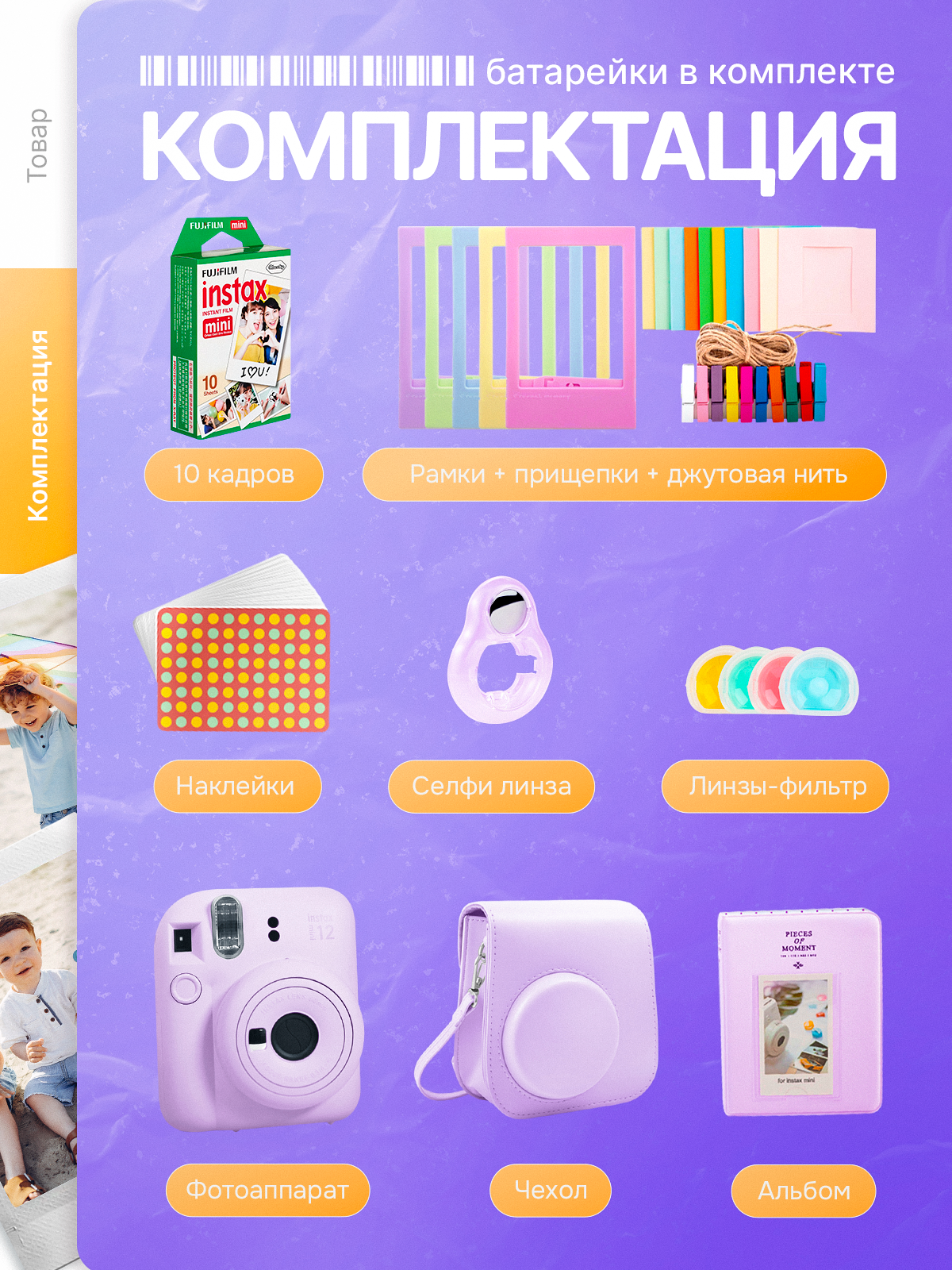 Купить Супер большой Набор c Фотоаппаратом моментальной печати Fujifilm Instax Mini 12 Фиолетовый, 10 предметов в наборе с доставкой по всей России.