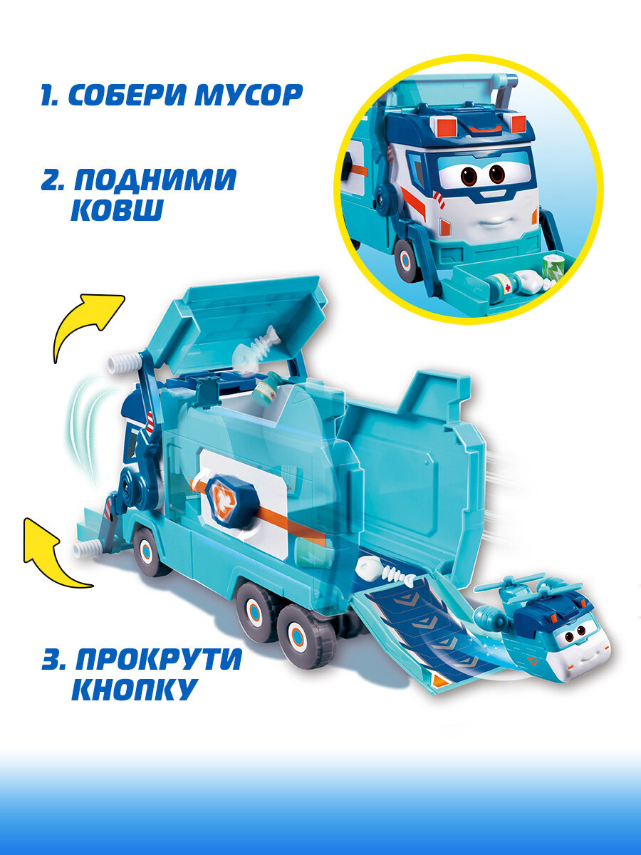Марк — мощная комбинация мусоровоза и дворника! Наиболее примечательной чертой Марка, оснащенного выдвижными скрубберами и распылителями воды, является его мощный вилочный погрузчик. Игрушка идеально подходит для воспроизведения миссий из мультфильма. Набор 3-в-1 с режимами подметания улиц, режимом уличного патруля и режимом переработки отходов. Откройте заднюю дверь машины, поднимите шест, чтобы перевернуть большой бункер, мусор упадет в маленький бункер. Подвиньте клапан чтобы очистить бункер. Поверните, чтобы активировать транспортную ленту, чтобы завершить миссию по переработке. Сияющая фигурка Шайна может соскользнуть с задней двери на новую миссию по уборке. Давайте начнем миссию с ним! Набор включает в себя 1 мусоровоз и уборочную машину Марк, 1 фигурку Шайна, а также 3 аксессуара и наклейки. Внимание! Не предназначено для детей младше 3-х лет!