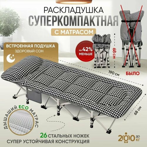 Уникальная разработка - мобильная раскладушка трансформер с матрасом. Берите раскладушку с собой куда угодно - максимально компактная, удобная и легкая! Храните ее дома, на даче или даже в машине - поместится куда угодно! Подарите себе или гостям - крепкий, здоровый сон без болей в шее или спине - новейшая ортопедическая конструкция! 3 ключевых преимущества: