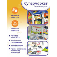 Игровой набор "Супермаркет" для игры в магазин обязательно понравится детям. В комплект входят: большой игрушечный прилавок с вывеской и полочками, кофейный аппарат, касса с игрушечным POS-терминалом и сканером, продуктовая корзина, всевозможные продукты, а также игрушечная кредитная карта и игрушечные деньги. При проведении картой в POS-терминале и нажатии кнопки на сканере раздаётся звуковой сигнал и загорается световой индикатор. Эти особенности набора добавляют особую реалистичность игре. Игра развивает коммуникативные навыки, воображение, логику, мелкую моторику, а также тренирует навыки устного счета. Характеристики: Возраст: 3+ Материал: пластик Батарейки: касса - 2 шт. тип АА, Сканер - 2 шт. тип ААА (в комплект не входят)
