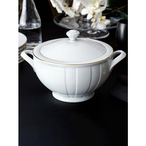 Супница - незаменимый элемент сервировки стола, который создает особую атмосферу уюта и гостеприимства. Изготовленная из высококачественного фарфора, эта супница обладает не только прочностью, но и изысканным внешним видом, который добавляет торжественности любому столу. Ее прекрасный дизайн и белоснежная отделка помогут добавить блеск и изысканность к сервировке праздничного стола, зафиксировав в памяти важные моменты и создавая теплые воспоминания о семейных обедах и ужинах. Этот уютный предмет будет радовать и дополнять ваше кухонное пространство, а также внесет особую яркость и красоту в семейные традиции. Благодаря своему удобному размеру, эта супница подойдет для сервировки разнообразных блюд, от супов и борщей до каши и окрошки, и станет идеальным дополнением для приема гостей или семейных посиделок. Уникальная крышка поможет сохранить неповторимый аромат готового блюда, а удобные ручки обеспечат комфорт и легкость при подаче. Эта бульоница станет не только любимым предметом интерьера, но и прекрасным подарком для близких на праздники, дни рождения или другие особенные случаи.