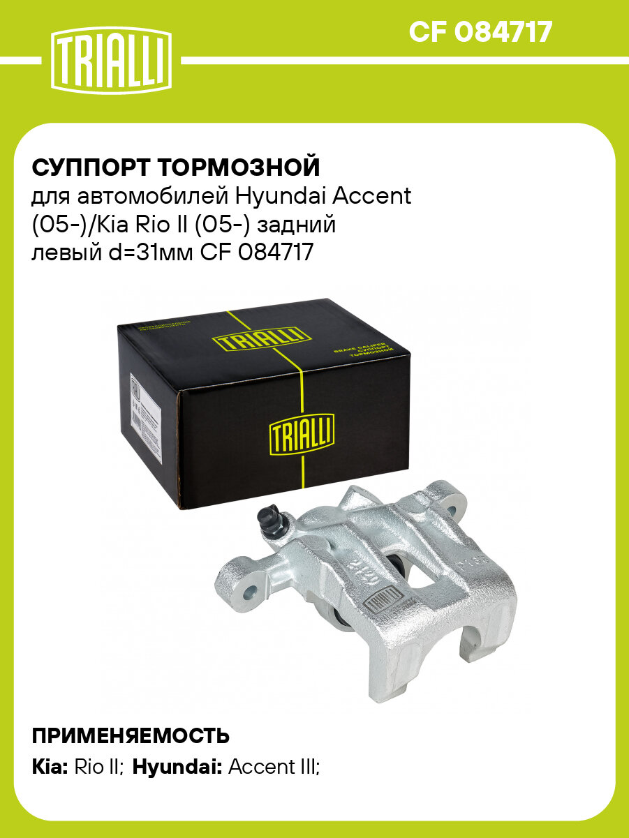 Суппорт тормозной для автомобилей Hyundai Accent (05-)/Kia Rio II (05-) задний левый d=31мм CF 084717 TRIALLI: сравнение цен, характеристики, фото, актуальное наличие и цены.