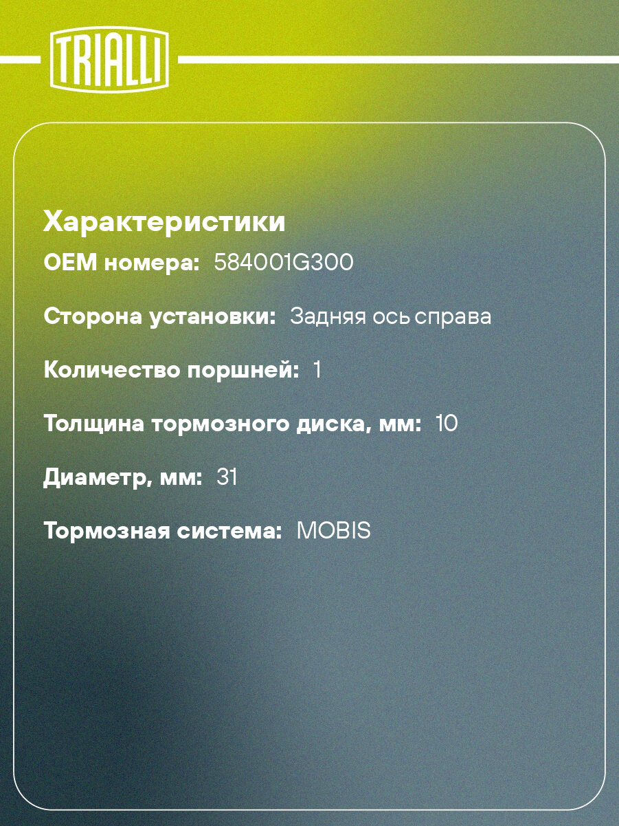 Суппорт тормозной для автомобилей Hyundai Accent (05-)/Kia Rio II (05-) задний правый d=31мм CF 084718 TRIALLI: сравнение цен, характеристики, фото, актуальное наличие и цены.