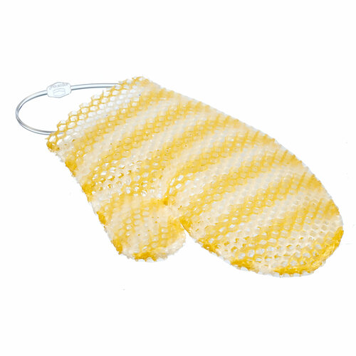 Мочалка для тела мягкая. Белые экстрамягкие полоски чередуются с мягкими жёлтыми.