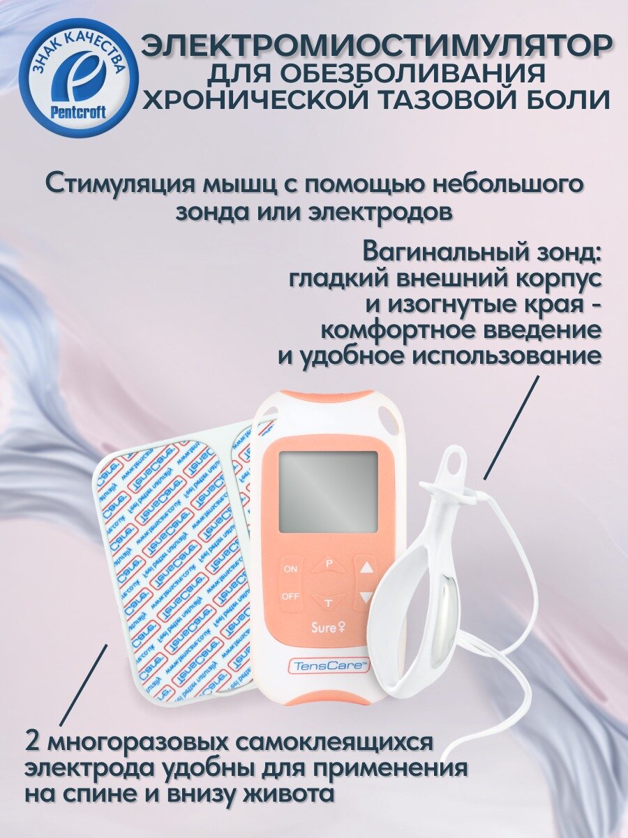 Любая боль — симптом неблагополучия в организме. Это нельзя считать нормой - здоровое тело не должно испытывать боли! Хроническая тазовая боль (ХТБ) или синдром хронической тазовой боли (схтб) - это перемежающаяся или постоянная боль в нижней части живота / малом тазу продолжительностью не менее 3–6 мес. Самой частой причиной хронической тазовой боли является эндометриоз. Боли при эндометриозе - один из самых ярких признаков: в начальной фазе заболевания боль всегда связана с появлением менструации, усиливается перед ней, в более запущенных случаях боль уже не зависит от цикла. Если Вы проходите лечение эндометриоза у врача и выполняете все его, но не готовы пить постоянно еще и обезболивающие препараты, – рассмотрите метод ЭМС. ЭМС – электрическая мышечная стимуляция. Именно она лежит в основе прибора TensCare Sure+: электрические импульсы блокируют болевые сигналы, идущие от очага боли в центральную нервную систему, и организм просто не считывает всю болезненность процесса. Электромиостимулятор Шуэ Плюс - это портативное устройство, которое создано специально для быстрой и эффективной блокировки боли в области таза у женщин при помощи электрических импульсов. Миостимулятор Sure + (Шуэ Плюс) имеет 5 программ: каждая программа - комбинация частоты и ширины импульса, а также возможность увеличения мощности сигнала. Для максимального обезболивания, рекомендуем использовать программу “PAIN” В комплект физиотерапевтического прибора Sure+ (Шуэ + ) входят вагинальный зонд и 2 многоразовых электрода - выберете наиболее комфортный для вас аксессуар для тренировки. Питание от 2х батареек типа «АА» Как часто надо использовать электромиостимулятор TensCare Sure+? 1 раз в день или через день по 20-30 минут, в удобное время. Рекомендованный курс 12 недель. Поддерживающая терапия 2-3 раза в неделю. Производство: Великобритания. Срок службы прибора – 15 лет, гарантия - 2 года. Попробуйте безопасный и эффективный альтернативный метод обезболивания уже сегодня!