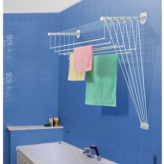 При использовании изделия настенная сушилка для белья нет необходимости тянуться к планкам, вы просто опускаете их на уровень груди и с комфортом развешиваете белье, далее поднимаете на настроенную высоту, зафиксировав специальные держатели к специальному креплению на стене.
